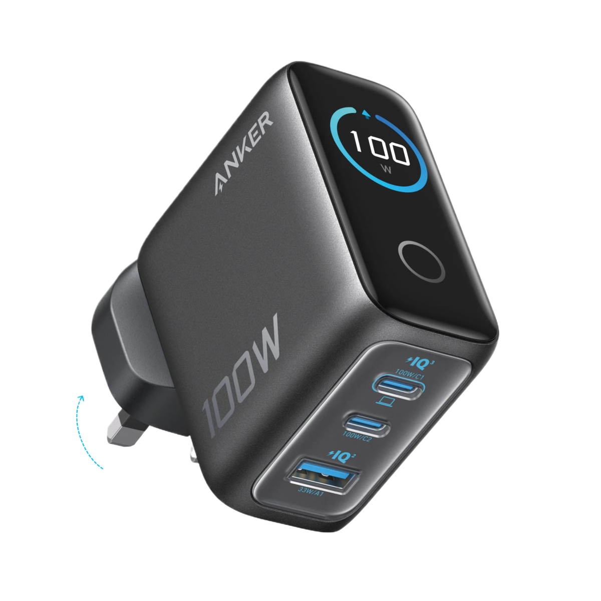 El cargador de Anker (100 W, 3 puertos, pantalla inteligente) es un accesorio de carga GaN, en el que cada puerto USB-C ofrece hasta 100 W de potencia cuando se utiliza solo. Cuando se utilizan los dos puertos USB-C simultáneamente, la potencia se comparte 70W:30W o 95W:5W. El tercer puerto es un USB-A de hasta 33W; si se utilizan las tres salidas, la potencia se distribuye 80W:12W:7,5W.