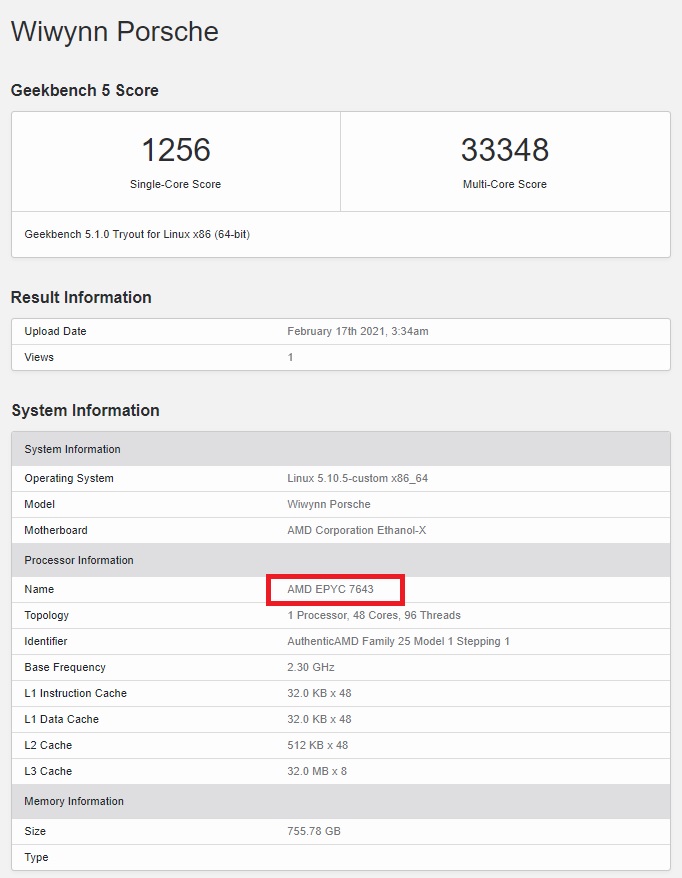 El chip de servidor EPYC 7643 ha sido visto en Geekbench 5 por Leakbench produciendo un poderoso resultado multinúcleo. No hace mucho tiempo, la misma unidad apareció en Geekbench 4 y obtuvo un magnífico rendimiento multinúcleo similar que dejó atrás a casi todos los demás procesadores. La pieza de 48 núcleos y 96 hilos consiguió 1.256 puntos en la prueba de un solo núcleo y 33.348 puntos en la prueba multinúcleo. Operando dentro de un servidor Wiwynn, el EPYC 7643 se registró a una frecuencia base de 2,30 GHz y alcanzó frecuencias de poco más de 3,4 GHz.