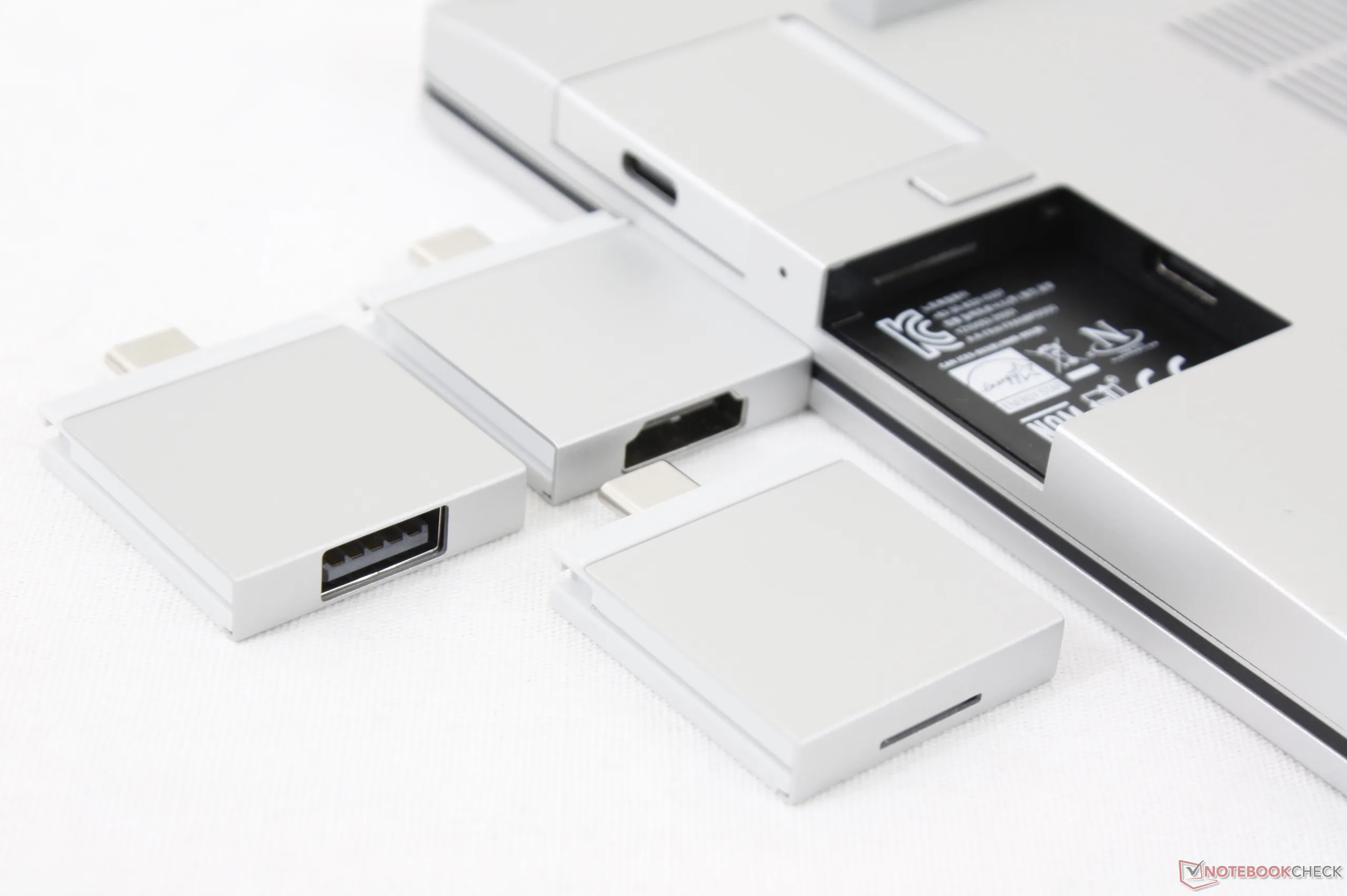 El Framework Laptop aborda este problema de frente permitiendo a los usuarios "cambiar" ciertos puertos por otros. Integra cuatro puertos USB-C compatibles con Thunderbolt que están empotrados en el chasis para que los usuarios conecten adaptadores especiales o tarjetas de expansión para convertirlos en puertos MicroSD, HDMI, DisplayPort o USB-A. Así, los usuarios pueden tener cuatro HDMI, cuatro DisplayPort, cuatro USB-A o incluso cuatro ranuras MicroSD si así lo desean. La idea es que los usuarios puedan intercambiar ciertos puertos para que se adapten mejor a sus cargas de trabajo diarias en lugar de estar limitados a los puertos fijos habituales.