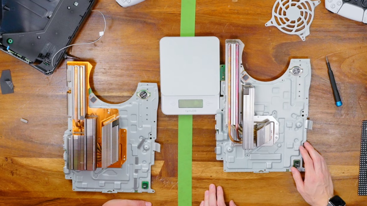 El disipador de la PS5 revisada disipador térmico inmediatamente parecía más pequeño, y después de retirar toda la placa base, Evans se quedó exclamando "¡Oh, Dios mío! Tengo como la mitad del disipador" Como era de esperar, el pesaje de las dos placas respondió a la pregunta de por qué la nueva PS5 es 300 g/0,66 lb más ligera que la PS5 original, ya que Sony parece haber recortado algunas de las partes de cobre y aluminio del disipador para ahorrar costes, dejando la consola funcionando a una temperatura más alta, pero dentro de lo que la compañía habría considerado una tolerancia aceptable.