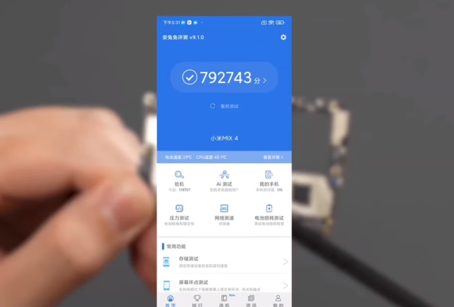 Curiosamente, en un momento de este vídeo de desmontaje específico del Mi Mix 4, hay un vistazo al resultado de rendimiento de AnTuTu para el último lanzamiento de Xiaomi. La puntuación total es de 792.743 puntos, una cantidad enorme que situaría al Mi Mix 4 en el top 10 del ranking actual del benchmark https://www.antutu.com/ranking/rank1.htm. Incluso hay una oportunidad de ver el impresionante soporte de carga por cable de 120 W del dispositivo en acción, con un gráfico que revela que solo se necesitan 20 minutos para llevar el Xiaomi Mi Mix 4 de 0% a 100% de carga