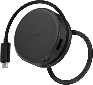 Como sugiere su nombre, el Satechi OntheGo 7-in-1 USB-C Hub es un concentrador USB-C compacto para uso móvil, que cuenta con algunas características únicas. Una de ellas es su diseño bastante inusual. Los siete puertos están dispuestos alrededor del perímetro del dispositivo redondo.