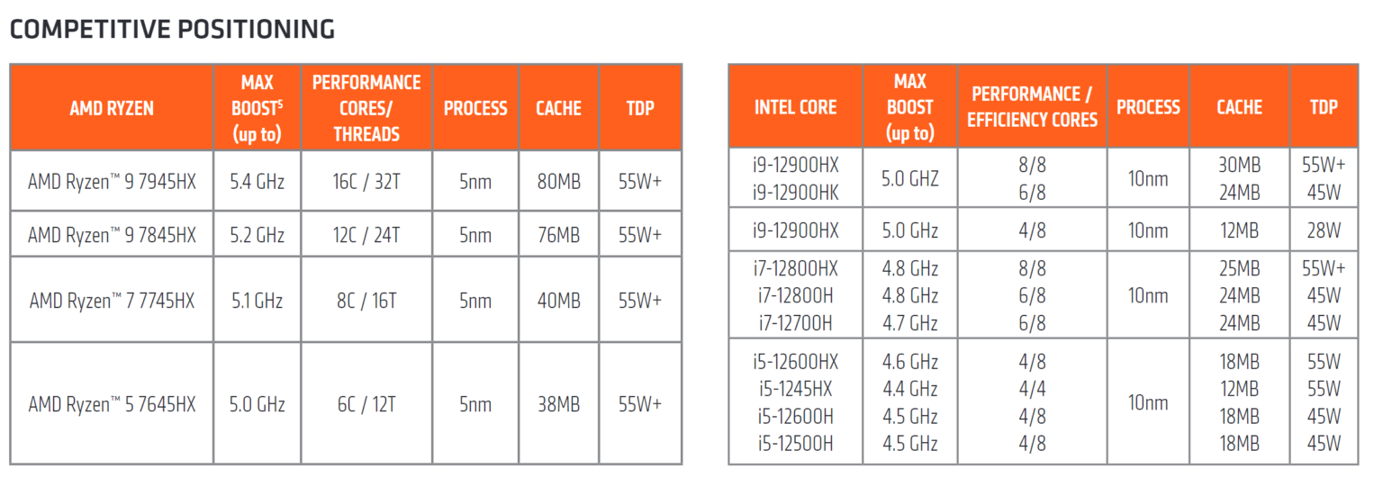 Además, AMD prevé que el Ryzen 9 7945HX y el Ryzen 9 7845HX como competidores directos del Core i9-12900HXmientras que los Ryzen 7 7745HX y Ryzen 5 7645HX están pensados para competir con los Core i7 y Core i5 H/HX de Alder Lake respectivamente.