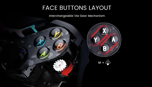 Lo hace mediante un mecanismo de engranaje, e incluso puede ver cómo funciona a través de la pequeña ventana transparente del mando. Para cambiar de una disposición a otra, los usuarios tienen que pulsar el botón etiquetado como "M" en la parte trasera del mando y el botón de acción inferior (A o B, según la disposición que se esté utilizando).