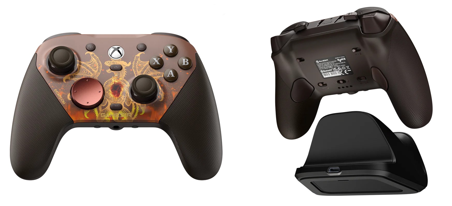 El mando de edición especial, que es una colaboración entre GameSir y Capcom, presenta un dragón en la placa frontal magnética extraíble, botones y thumbsticks marrones, y un D-pad circular rojo oscuro. También viene con una base de carga que lleva el logotipo del juego.