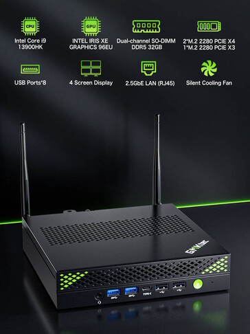 La última incorporación de GMKtec tiene antenas WiFi externas claramente visibles, que están conectadas a un módulo AX201 que también soporta Bluetooth 5.2. También incorpora un puerto Ethernet de 2,5 Gbit/s. Además, el mini PC puede manejar un total de tres unidades SSD M.2 2280, por lo que incluso se pueden almacenar localmente grandes cantidades de datos. El resto de opciones de conectividad del NucBox K10 incluyen USB Type-C, dos puertos HDMI, un DisplayPort y cuatro puertos USB 3.2 y USB 2.0 cada uno.