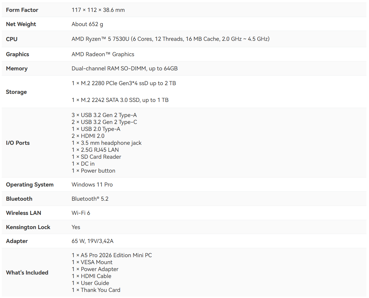 Geekom ha presentado el A5 Pro 2026 Edition como un nuevo mini PC potenciado por AMD, pero no viene con ninguna actualización propiamente dicha respecto a la última versión que la marca lanzó en enero de 2026. Para echar la vista atrás el PC presentado anteriormente incorpora el Ryzen 5 7430U, que es un procesador idéntico al AMD Ryzen 5 5625U de la línea Barcelo-U.