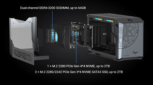 Además, el mini PC FUN11 viene con 32 GB de RAM DDR4 y 1 TB de SSD. Los usuarios pueden ampliar la configuración con hasta 64 GB de RAM DDR4 a 3200 MHz (kit Crucial RAM de 64 GB con un precio actual de 109,99 dólares en Amazon) y 4 TB de almacenamiento total. En cuanto al almacenamiento, el sistema cuenta con una M.2 PCIe Gen 4 y dos ranuras M.2 PCIe Gen 3.