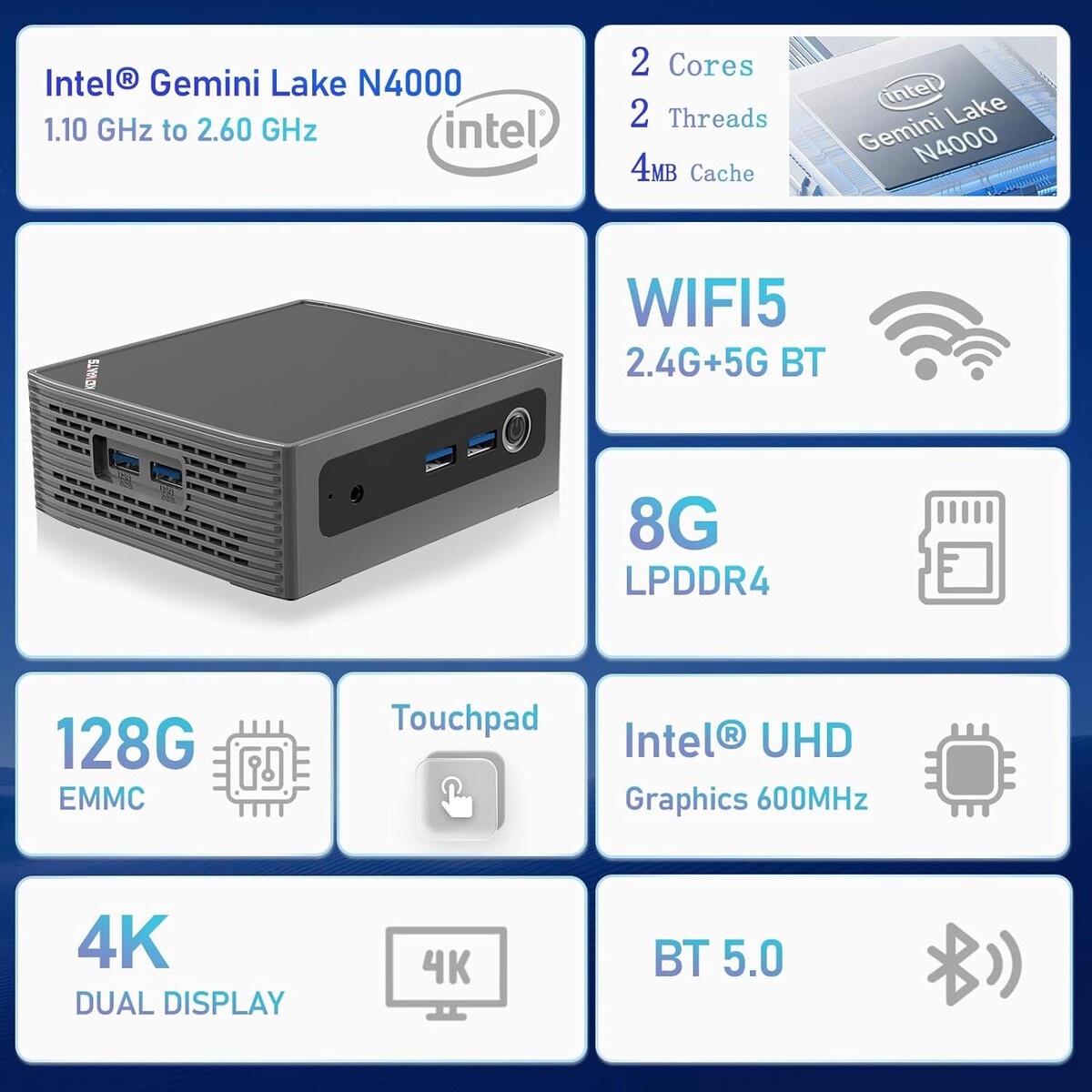 En cuanto al mini PC en sí, el Kidwants KN1 es un sistema de bajo consumo con un procesador Intel Celeron N4000 procesador. Esta CPU de doble núcleo está emparejada con 128 GB de eMMC almacenamiento y 8 GB de RAM LPDDR4. El almacenamiento puede ampliarse aún más a través de la ranura M.2 del interior, que puede albergar hasta una unidad SSD 2280 de 1 TB.