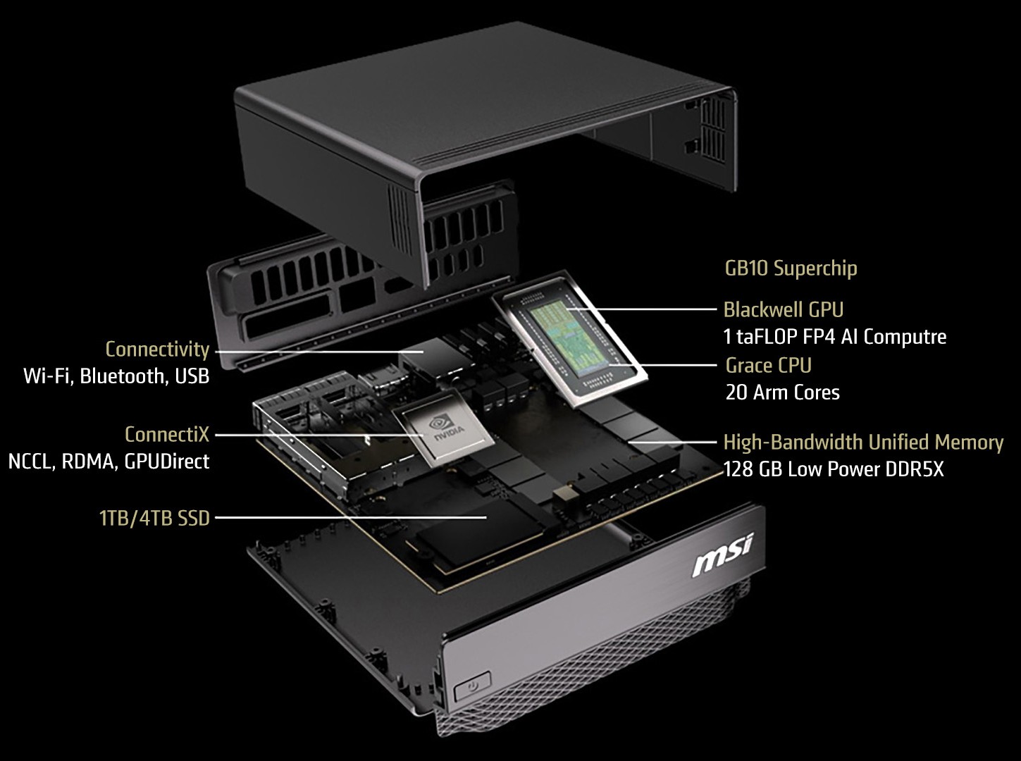 Las especificaciones del 99SUS 1 TB son esencialmente las mismas que las del MS-C931 original, salvo que la versión de Bluetooth se ha rebajado de 5.4 a 5.3. Por lo demás, está alimentado por el GB10 superchip con una GPU Blackwell capaz de procesar 1 PetaFLOP de instrucciones de IA FP4 más una CPU Grace con 10 núcleos ARM Cortex-X925 y 10 núcleos ARM Cortex-A725. El superchip se complementa con una memoria de sistema unificada LPDDR5X de 128 GB con un ancho de banda de 273 GB/s. Tanto la CPU como la GPU pueden acceder al conjunto de memoria RAM LPDDR5X a través de una interconexión NVLink C2C que ofrece un ancho de banda 5x PCIe 5.0. En cuanto al almacenamiento, MSI ofrece opciones de SSD NVMe de 1 o 4 TB. La carcasa mide 151 x 151 x 52 mm (1,19 L de volumen) y pesa 1,2 kg.