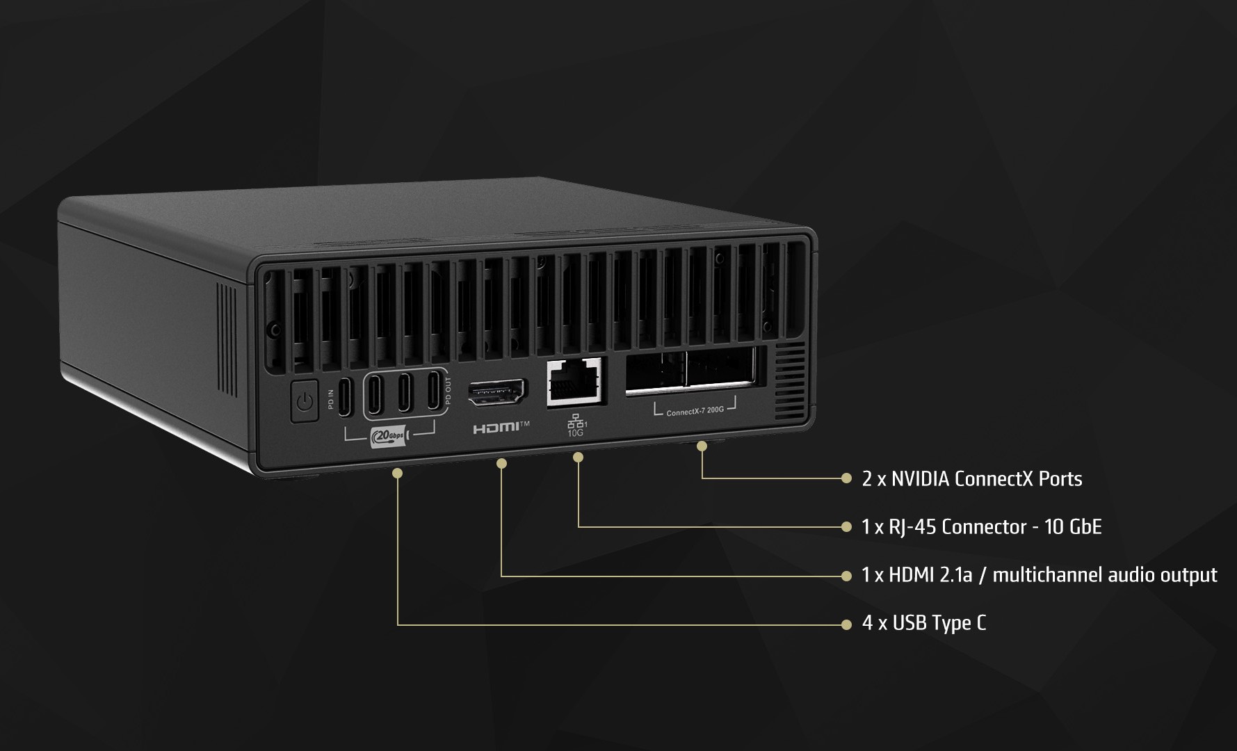 La selección de puertos incluye 4X puertos USB-C 3.2 a 20 Gbps con funcionalidad PD, una salida de vídeo HDMI 2.1a con salida de audio multicanal, una NIC 10 GbE y 2x Nvidia ConnectX-7. La conectividad inalámbrica está garantizada mediante una conexión Wi-Fi 7 + tarjeta BT 5.3.