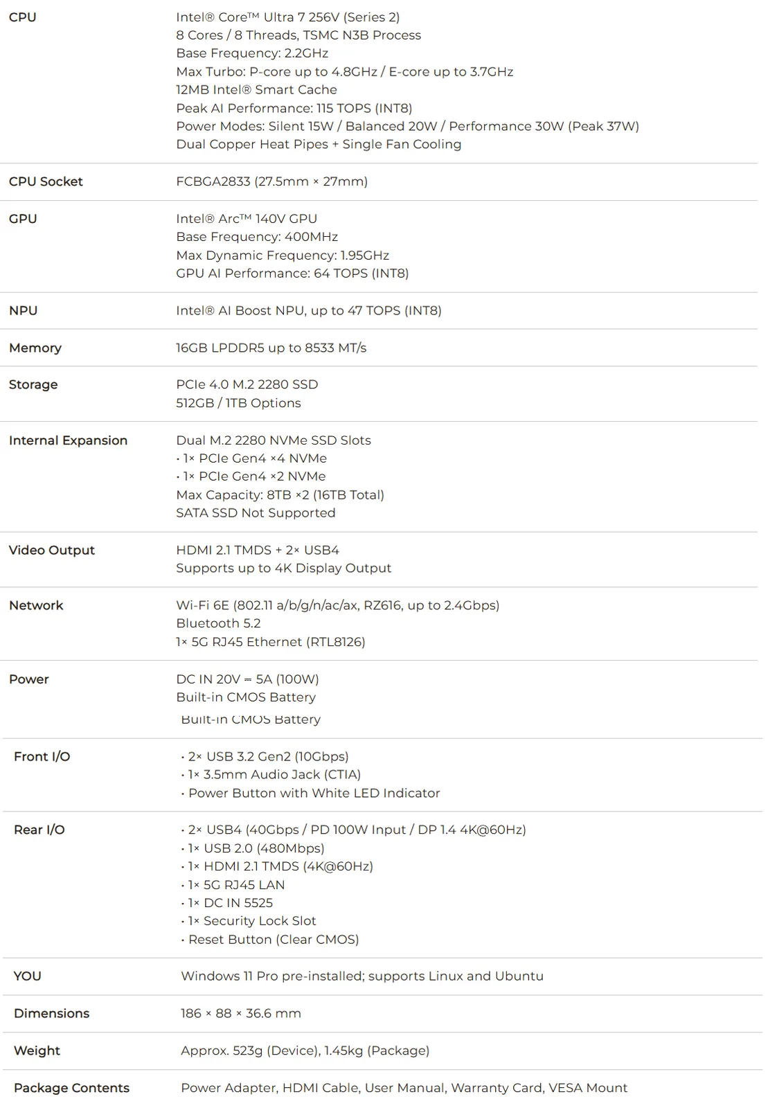 Bajo el capó, este pequeño mini PC lleva el Intel Core Ultra 7 256V, un procesador de gama media alta de la línea Lunar Lake. Cuenta con la Arc 140V iGPU, que puede manejar sin problemas un buen número de juegos modernos a la resolución 1080p con ajustes en la configuración visual.