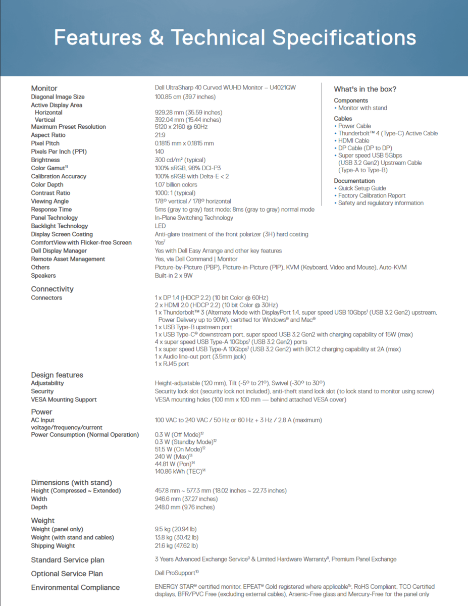 El UltraSharp 40 es un panel curvo WUHD 5K de 2.500R de 5.210 x 2.160 IPS con una frecuencia de actualización de 60 Hz y un tiempo de respuesta de 5 ms de gris a gris en modo rápido. El UltraSharp 40 Curved parece ser una muy buena opción para trabajos en color, dada su cobertura de gama de colores del 100% sRGB, 100% Rec.709 y 98% DCI-P3. Dell ComfortView Plus permite una baja emisión de luz azul sin afectar drásticamente el rendimiento del color. El monitor también viene con altavoces duales de 9W integrados, además de tener un conector de salida de audio de 3,5 mm.