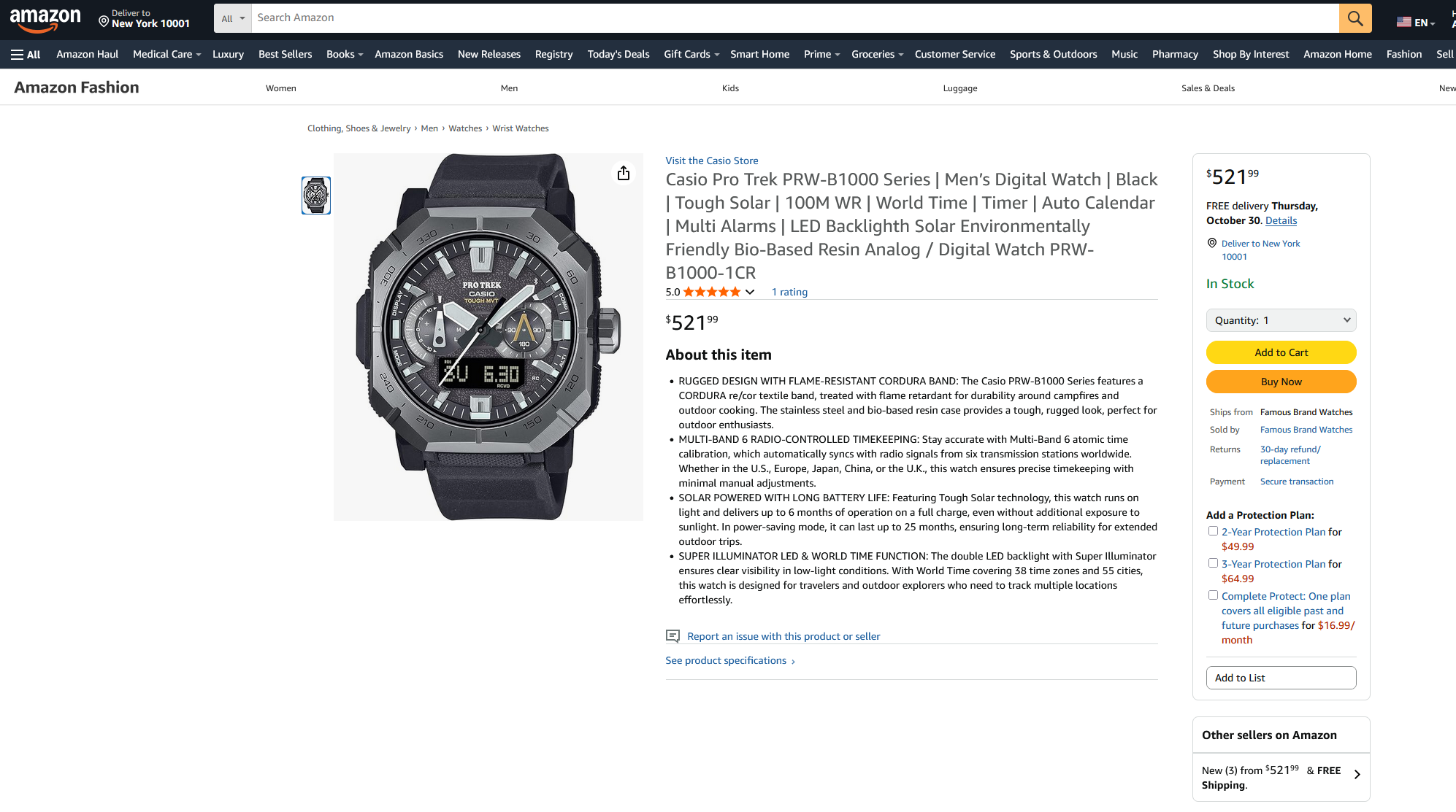En Amazon, el PRW-B1000-1 aparece por aproximadamente 120 dólares menos que el precio de Casio en EE.UU., e incluye el envío estándar dentro de Estados Unidos. Las descripciones del producto en ambas plataformas son coherentes en cuanto a características y especificaciones, y el vendedor de Amazon tiene buenas valoraciones aparte de un par de anomalías. En definitiva, si está pensando en hacerse con el PRW-B1000-1 en EE.UU., quizá le convenga más comprarlo en Amazon.