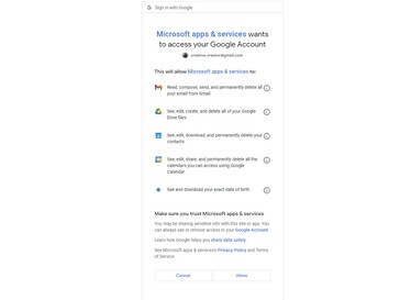 Cuando se añade una cuenta de Gmail, el usuario observará que las aplicaciones y servicios de Microsoft (esto está mal escrito o el usuario también está concediendo acceso total a otras aplicaciones de Microsoft al añadir el acceso de Gmail a Outlook para Windows) podrán hacer lo siguiente: