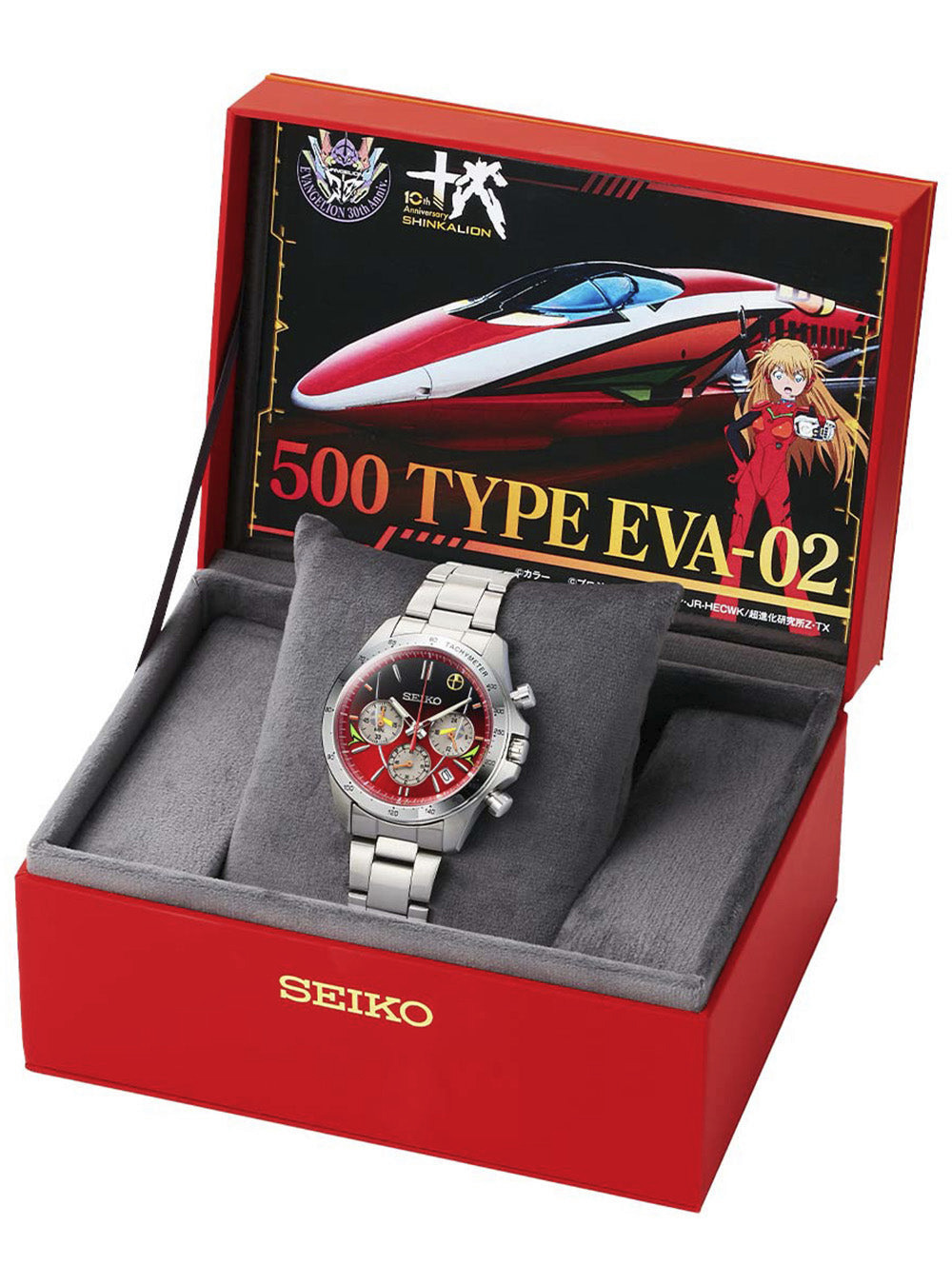 El reloj sigue la línea de las anteriores colaboraciones de Seiko con Evangelion y Shinkalion, pero éste se parece más a la librea del tren 500 Tipo EVA-02 que circuló por la línea Sanyō Shinkansen como parte de un proyecto del aniversario de Evangelion en el mundo real. La combinación de colores se ha tomado casi al pie de la letra: secciones exteriores rojas, centro negro y acentos metálicos que recuerdan los detalles de la cabina del tren. Incluso el marcador de la 1 reproduce el marco circular de la ventanilla utilizado en el Shinkansen temático del EVA-02.