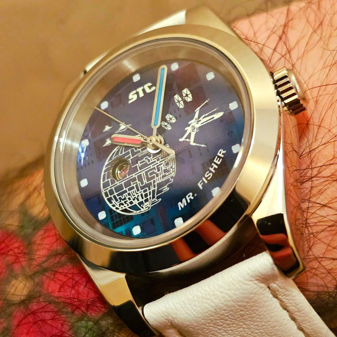 El reloj funciona con un NH38 decorado dentro de una caja de 40 mm con un cristal de zafiro en la parte superior, pero la esfera es lo que llama la atención inmediatamente. Es un diseño estilo oblea con capas de gráficos de La guerra de las galaxias: la Estrella de la Muerte, un par de naves enzarzadas en una persecución y un pequeño texto en el que se lee "Mr. Fisher", una clara referencia a Carrie Fisher que interpretó a la princesa Leia en las películas originales de La guerra de las galaxias. El fondo cuadriculado y la superficie ligeramente reflectante indican que el constructor utilizó una pieza real de oblea de silicio como base, aunque más tarde aclararon que sólo el trabajo de la esfera está hecho a mano. El chip litográfico real no se utiliza porque fabricar esos requiere herramientas industriales que cuestan mucho más allá del alcance de los aficionados.