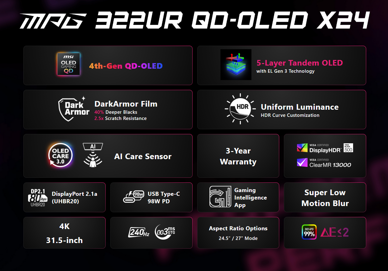 En cuanto al panel, el modelo "X24" está equipado con un panel QD-OLED en tándem de 4ª generación (probablemente de LG) basado en la tecnología EL Gen 3. Esta configuración de 5 capas afirma aumentar la eficiencia lumínica en un 30% a la vez que reduce el consumo de energía. La protección corre a cargo de la película "DarkArmor" -MSI afirma que aumenta la resistencia a los arañazos en 2,5 veces y profundiza los negros en un 40%- y de un AI Care Sensor impulsado por NPU que atenúa la pantalla cuando no se detecta presencia humana para evitar que se queme. Automatiza la protección de los píxeles basándose en el "conocimiento del entorno en tiempo real".