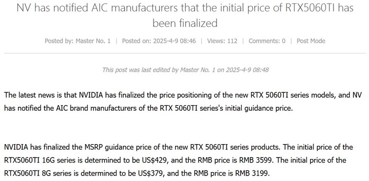 Según la información publicada en Board Channels (vía VideoCardz), Nvidia ha fijado el precio inicial de la RTX 5060 Ti en 429 dólares (3.599 RMB) para la variante de 16 GB. Según los informes, el precio de la RX 5060 Ti de 8 GB es 50 dólares menos, 379 dólares (3.199 RMB). Estos precios, si son exactos, son relativamente buenos si tenemos en cuenta los precios de lanzamiento de la RTX 4060 Ti de 8 GB y 16 GB variantes.