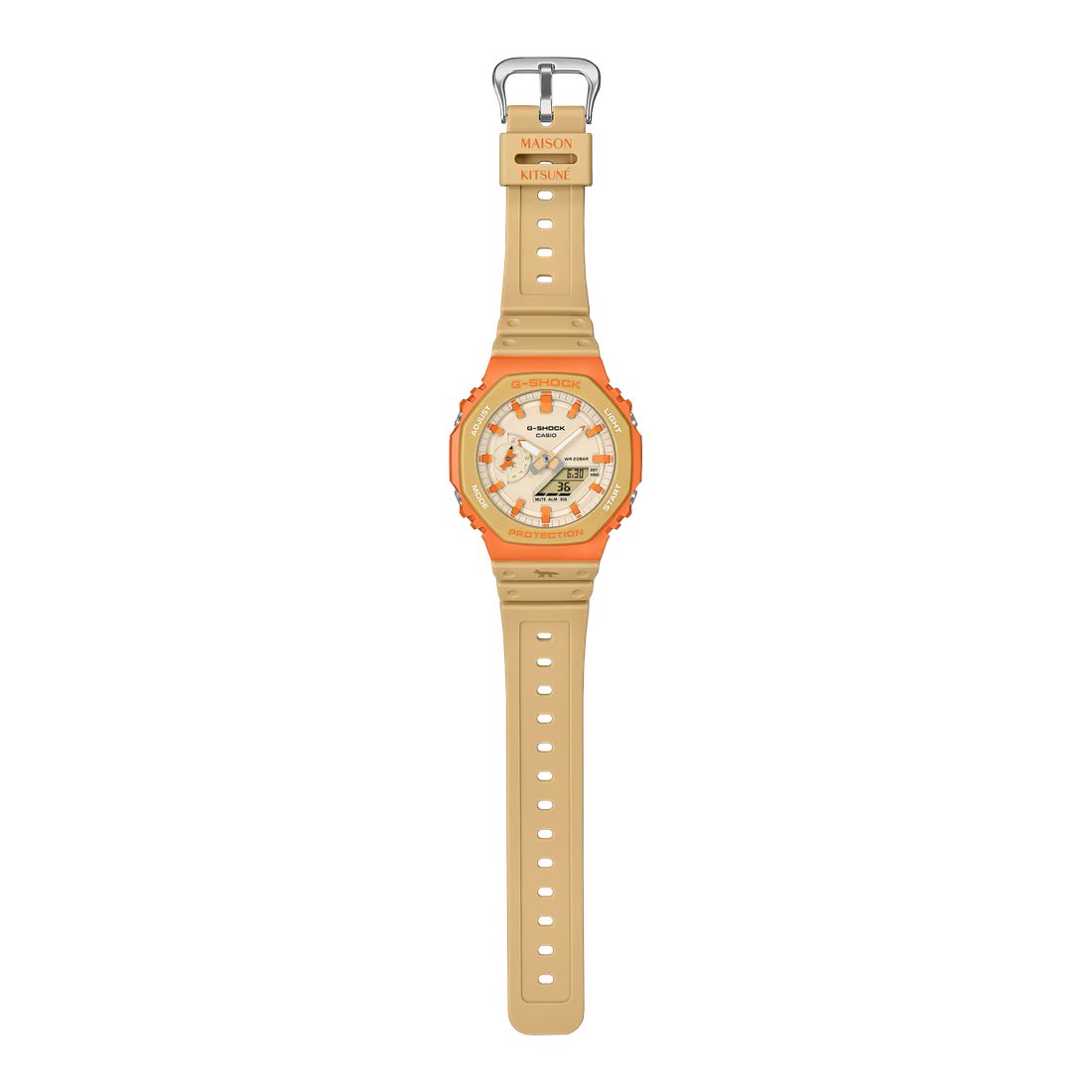 El GA-2110MK es un reloj digital analógico basado en la popularísima serie GA-2100 octogonal. Se inspira en el esquema de color "camaieu", utilizando tonos neutros, beige terroso y crema, inspirados en la histórica arquitectura haussmaniana de París. Los tonos apagados están salpicados por un bisel de resina de un naranja intenso, que según Casio pretende evocar la puesta de sol brillando sobre el horizonte de París. El reloj se envía en un embalaje especial a juego con la combinación de colores de Camaieu.