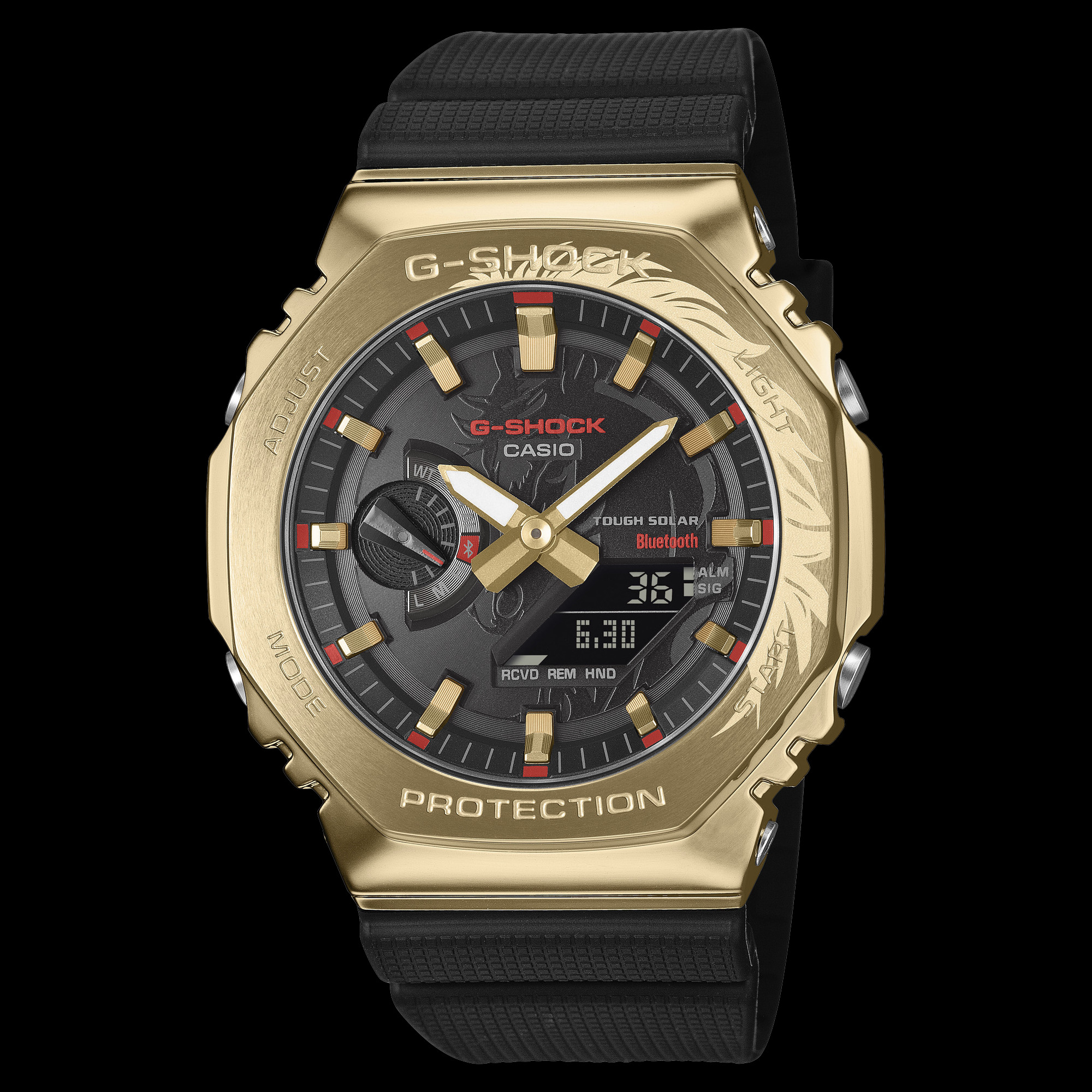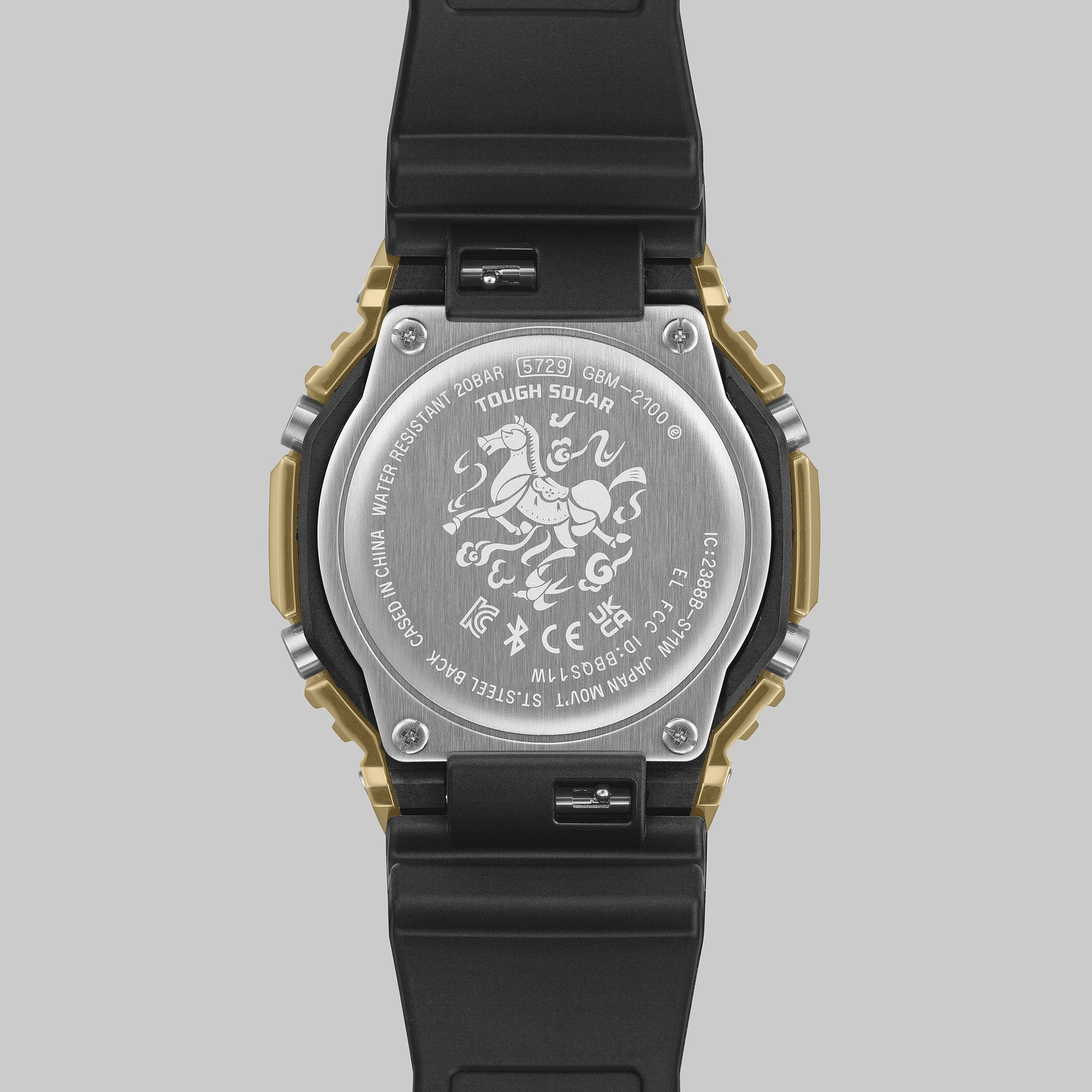 El GBM-2100CX-9A de Casio presenta el mítico caballo mille-li, que está grabado en relieve en su esfera negra. La crin del caballo está grabada en el bisel de acero inoxidable de color dorado, y el animal puede encontrarse de nuevo en el fondo metálico de la caja. Este reloj tiene la caja y la correa de resina negra, con detalles rojos en la esfera.