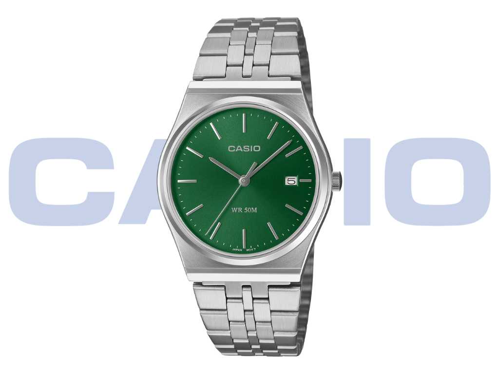 Casio ha lanzado su nuevo MTPB145DC-3AV reloj de acero inoxidable, con un estilo vintage de los años 80. Con un precio de 110 dólares en EE.UU., este reloj es un auténtico retroceso. Combina una esfera verde minimalista con una caja clásica y una correa de acero.
