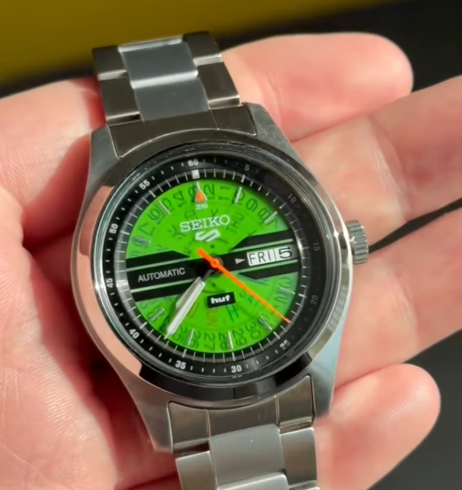 Las imágenes prácticas recién vistas, gracias a @SeikoLeaks en YouTubenos ofrecen una visión práctica de cómo la esfera de acetato "HUF Green" interactúa con la luz. Como era de esperar, hay un alto grado de transparencia que deja al descubierto las ruedas mecánicas del día y la fecha bajo la superficie. La ejecución de la esfera, inspirada en el "Time Sonar" de los años 70, crea un efecto tridimensional en capas que no se ve normalmente en la línea Seiko 5 de gama básica. Mientras que los renders promocionales suelen desinfectar estas texturas, las tomas físicas revelan un carácter industrial único, con la barra horizontal negra "Automático" y el logotipo "huf" a las 6 en punto que parecen flotar sobre el disco verde.