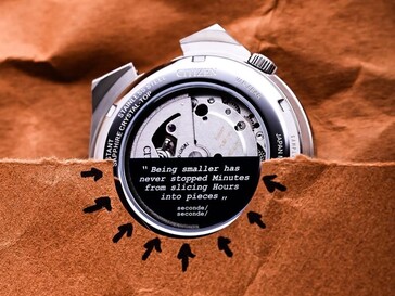 El fondo de caja de exposición también se muestra en detalle. El Calibre 8210 automático es visible bajo un exclusivo mensaje impreso que reza: "Ser más pequeño nunca ha impedido que los Minutos corten las Horas en pedazos" El reloj tiene cristal de zafiro, resistencia al agua de 5 bares y construcción de acero inoxidable.