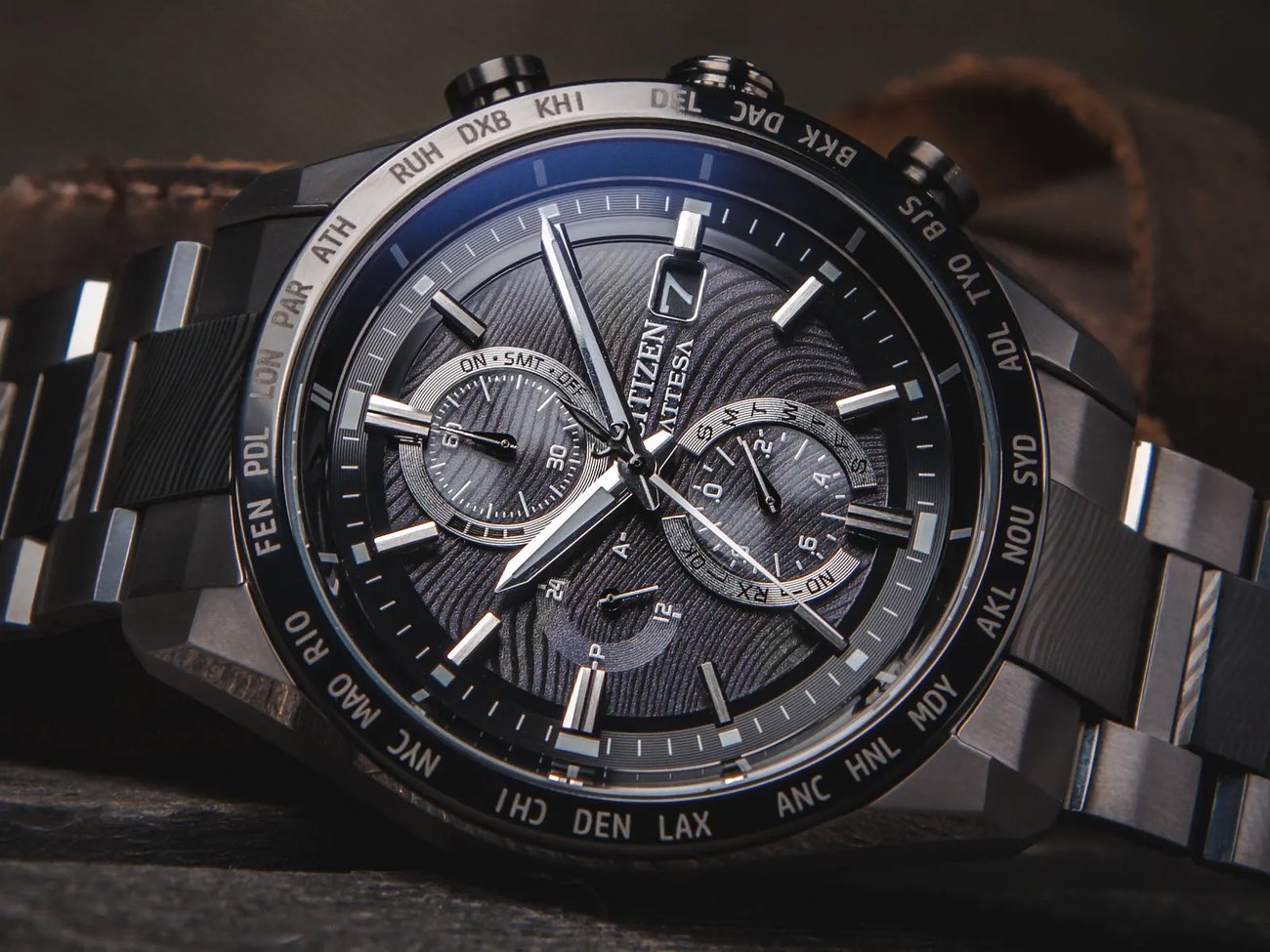 En su interior, el reloj incorpora el movimiento H800 Eco-Drive, que extrae energía de cualquier fuente de luz ambiental para mantener cargada la pila interna. Al formar parte de la serie Attesa, también ofrece capacidades de cronometraje atómico multibanda, lo que significa que el reloj puede sincronizarse automáticamente con las torres de radio para ajustar la hora en 26 husos horarios con una precisión superior.