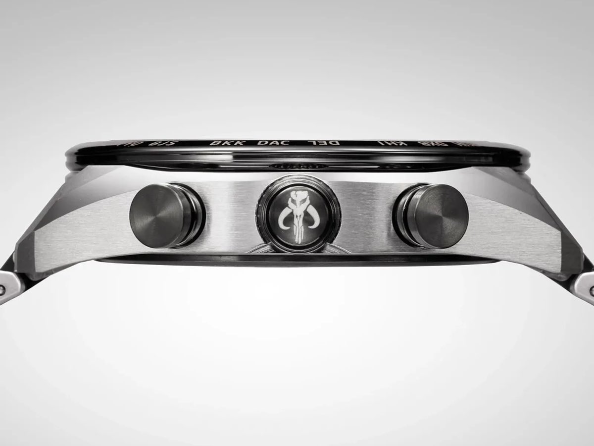 El diseño general parece relativamente sobrio. La esfera negra texturizada presenta tres subesferas e índices plateados aplicados, con la mayoría de las referencias mandalorianas metidas en los detalles. Hay un emblema del mitosaurio grabado en la corona, mientras que el fondo de la caja lleva grabado el texto "The Mandalorian" junto a su icónico casco.