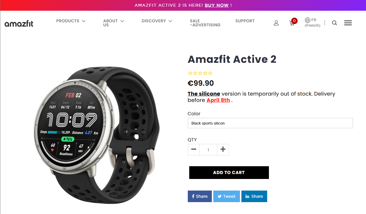 Este problema de falta de existencias está afectando a mercados como Francia, España, Italia y Alemania. Aquí, el listado de la tienda Amazfit para el smartwatch Active 2 Black Sport Silicone indica que este modelo está "temporalmente agotado". La empresa afirma que espera que el wearable se reponga antes del 8 de abril. Sin embargo, el modelo sigue disponible actualmente a través de Amazon en cada uno de estos países. También cabe señalar que no parece haber problemas de existencias de este producto en el Reino Unido ni en Estados Unidos.