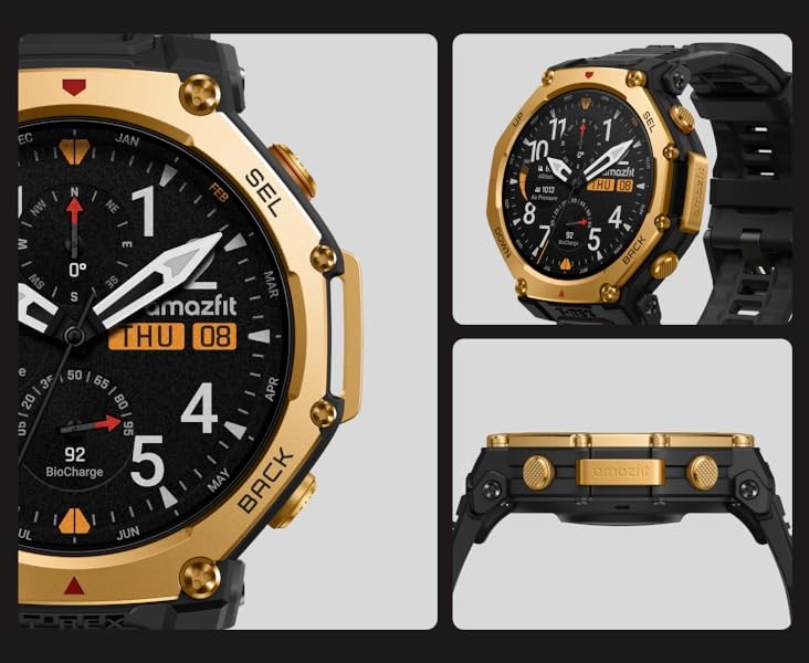 El smartwatch Amazfit T-Rex 3 Pro Black Gold (48 mm) tiene características idénticas a la versión Tactical Black. Tiene una pantalla AMOLED de 1,5 pulgadas, con hasta 3.000 nits de brillo y cristal de zafiro resistente a los arañazos, rodeada por un bisel de titanio de color dorado. Entre sus herramientas se incluyen el sistema de navegación por seis satélites con indicaciones giro a giro, más de 180 modos deportivos, incluidos el rucking y el buceo recreativo, y el seguimiento del nivel de energía BioCharge. Además, hay una linterna integrada que ofrece dos colores y compatibilidad con llamadas por Bluetooth.