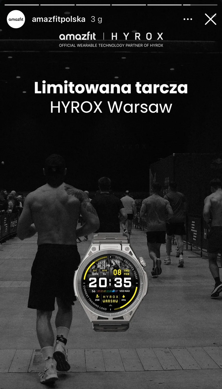 Ahora, una imagen y un vídeo del inédito smartwatch de Amazfit han aparecido en la cuenta oficial de Instagram de Amazfit Polonia, https://www.instagram.com/amazfitpolska/. Este contenido, que desde entonces ha sido eliminado por la empresa sin comentarios, promocionaba el próximo evento HYROX Varsovia. Una de las imágenes (abajo) incluía el texto "Limited edition HYROX Warsaw face" (cara de edición limitada HYROX Varsovia) (traducción automática).
