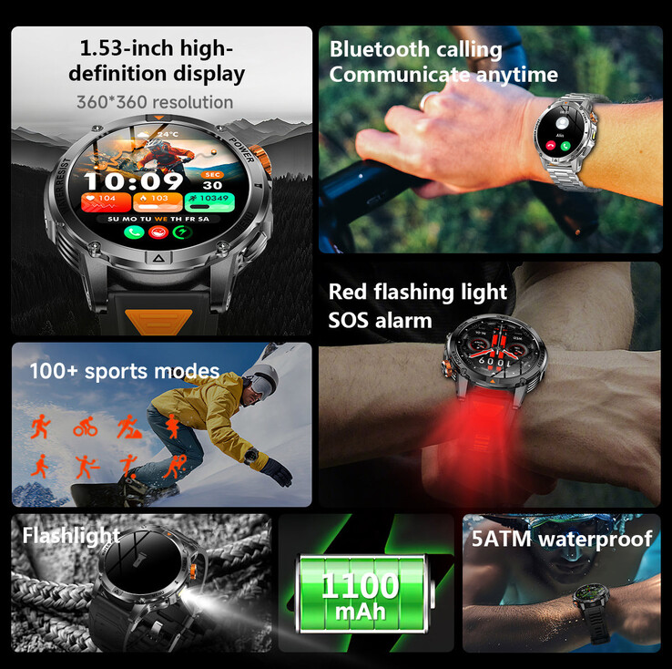 La batería de 1.100 mAh es uno de los mayores reclamos aquí: la empresa afirma que el reloj proporciona más de 100 días de tiempo en espera. Para un reloj de este tamaño, esa capacidad es sustancial, aunque el procesador 8773EWE es un chip básico de bajo consumo habitual en esta categoría. El uso en el mundo real con la conexión Bluetooth 5.2 activa probablemente no alcance esa marca del siglo.