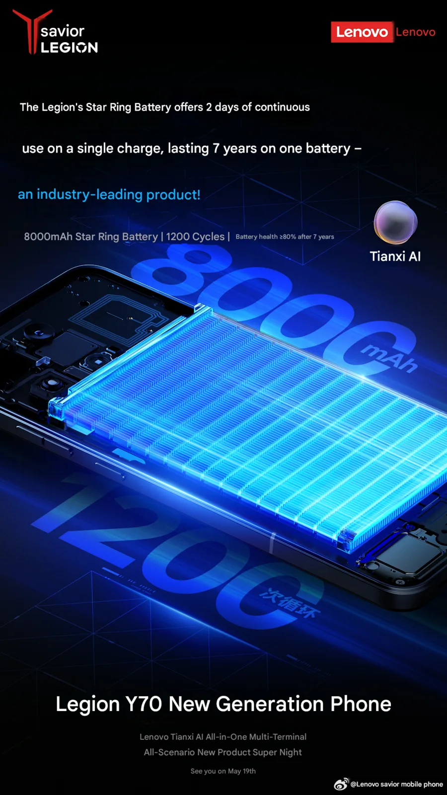 Como se reveló recientemente, el próximo y renovado teléfono para juegos Legion Y70 contará con una batería de 8.000 mAh. La compañía afirma que puede ofrecer una duración de la batería de 2 días, pero la marca no compartió si esta calificación de tiempo de ejecución reclamado es para uso pesado o regular.