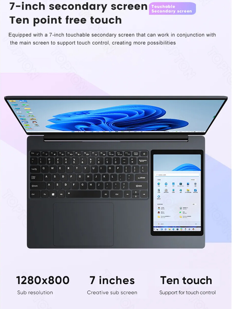 Las pantallas del portátil de doble pantalla L10 tampoco son tan premium como las del Lenovo ThinkBook Plus. Tiene una pantalla principal FHD de 15,6 pulgadas y una pantalla secundaria de 7 pulgadas en el lado derecho del teclado. Topton afirma que la pantalla más pequeña admite un lápiz óptico y entrada multitáctil de 10 puntos. Pero el portátil no incluye un lápiz.