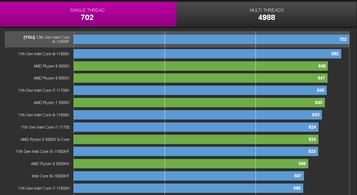 La puntuación de un solo hilo del chip Alder Lake de 6 núcleos es lo suficientemente alta como para superar al Ryzen 9 5900X (648 puntos) y al Intel Core i9-11900K (682 puntos). La puntuación multihilo acaba siendo de 4.988 puntos, lo que es lo suficientemente decente como para situar al Intel Core i5-12400F justo por detrás del AMD Ryzen 7 5800X (4.994 puntos) en la tabla CPU-Z Validator para chips con capacidad de 12 hilos. Una vez más, el Ryzen 5 5600X se queda atrás, pero esta vez está más cerca con 4.811 puntos (-3,55%).