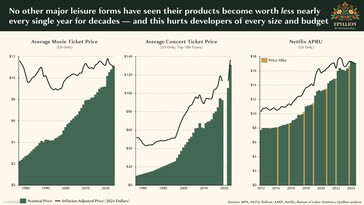 El analista Matthew Ball, de Epyllion, en su presentación State of Video Gaming in 2025 predice cómo GTA 6 podría influir en la fijación de precios en la industria de los videojuegos. El analista señala que los videojuegos empaquetados han visto bajar sus precios en los últimos 44 años en términos de dólares reales. Por el contrario, otras formas de entretenimiento como las películas, los conciertos y Netflix han visto aumentar sus precios durante décadas.