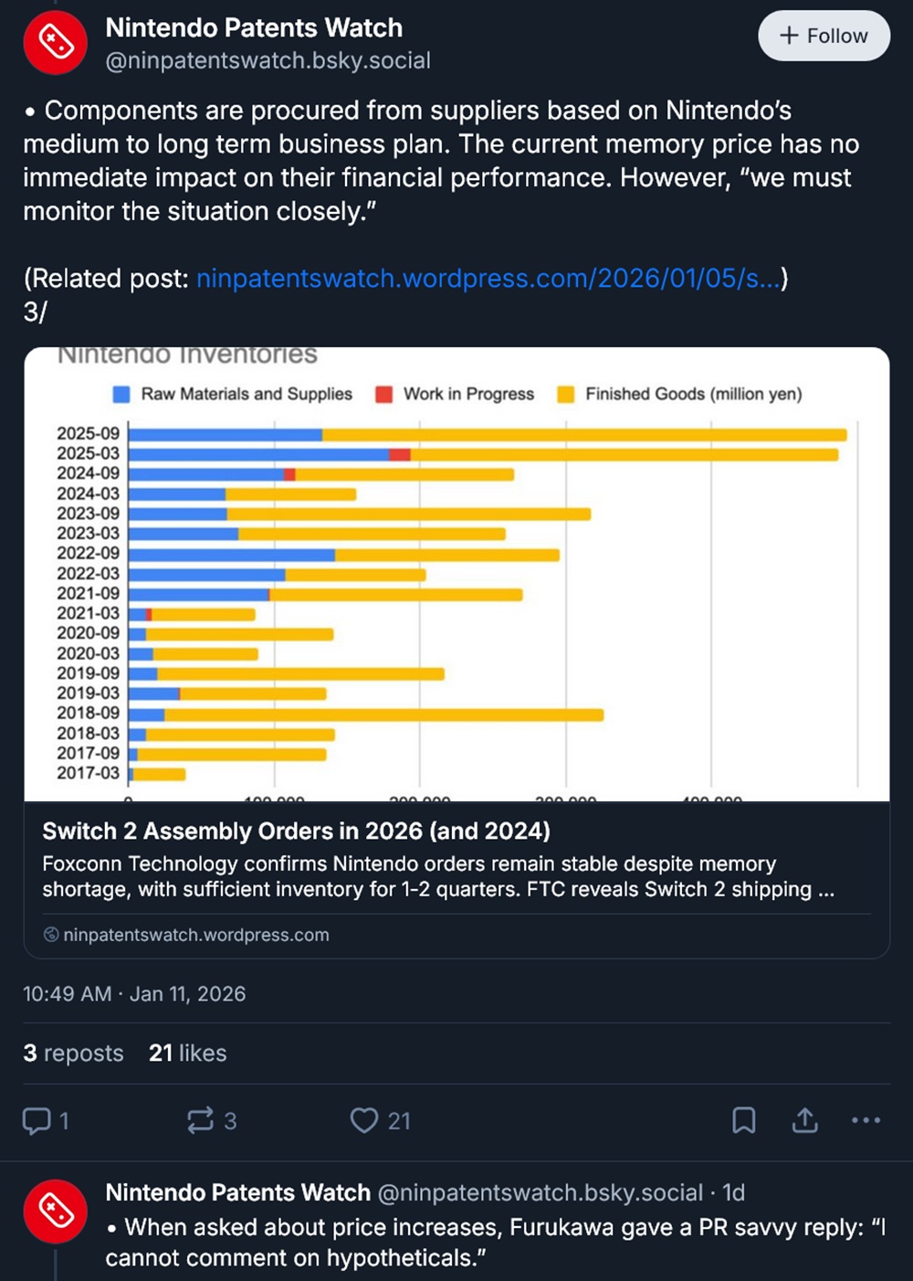 Los precios sin precedentes de las memorias están disparando el coste de los PC para juegos, pero las consolas también están amenazadas. El Kyoto Shimbun (de pago) preguntó al presidente de Nintendo Shuntaro Furukawa sobre los posibles efectos en la última consola portátil de la compañía. La cuenta Bluesky de Patents Watch tradujo algunos puntos clave, incluida una pregunta sobre un Aumento de precio de Switch 2.