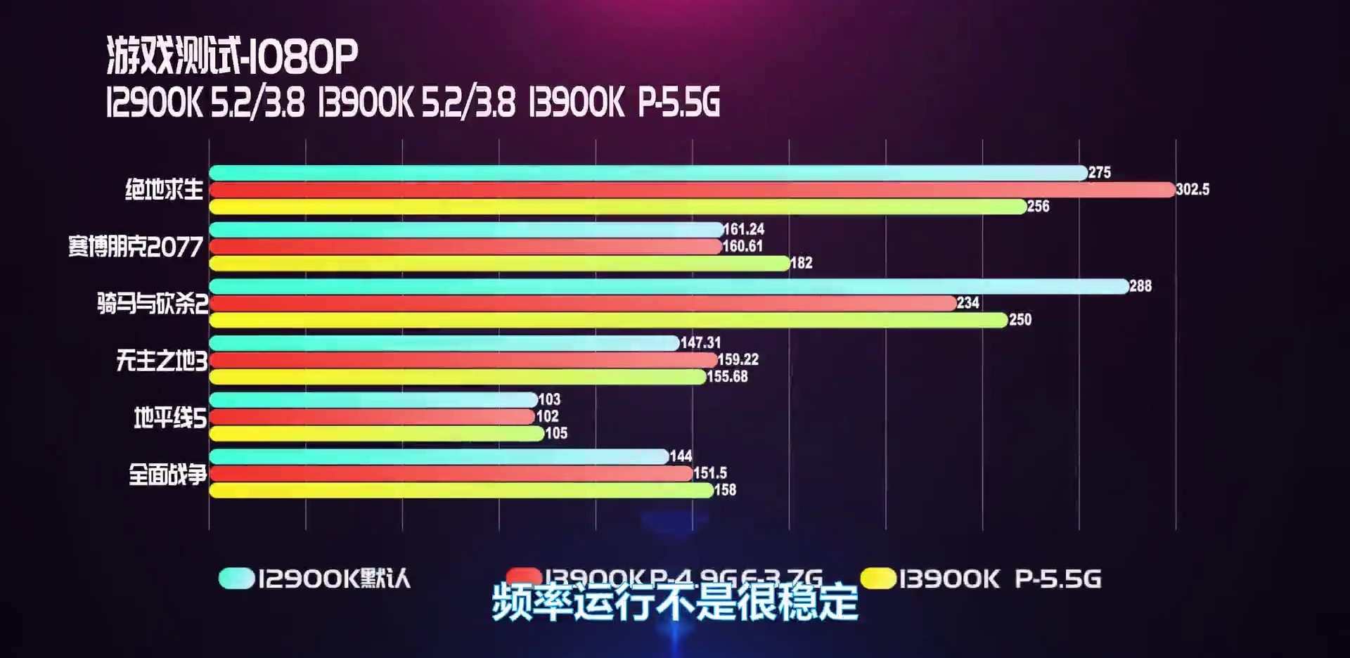 Por ejemplo, en Cyberpunk 2077, el Core i9-13900K con sus núcleos P y E funcionando a 4,9 y 3,7 GHz respectivamente, produjo 157,94 fps. El Core i9-12900K superó al procesador de13ª generación con 174,32 fps, una ventaja de aproximadamente el 10%. Después de que el analista overclockeara los núcleos P y E de ambas CPUs a 5,2 y 3,8 GHz respectivamente, el Core i9-13900K a menudo igualaba o superaba el rendimiento de su predecesor.