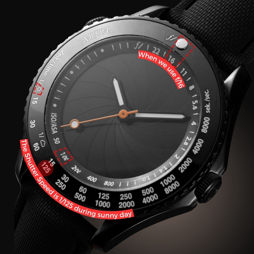 Estos elementos no sólo cumplen una función decorativa, sino que también permiten al usuario calcular la velocidad de obturación correcta para una exposición adecuada. Por ejemplo, leyendo el bisel desde dentro hacia fuera, se puede ver que a ISO 400 y f/16, la velocidad de obturación correcta es de 1/500s a la luz del sol y de 1/60s a la sombra. La apertura seleccionada puede ajustarse girando el bisel. El reloj tiene una caja de acero inoxidable resistente al agua hasta 50 metros y la esfera está protegida por un cristal de zafiro