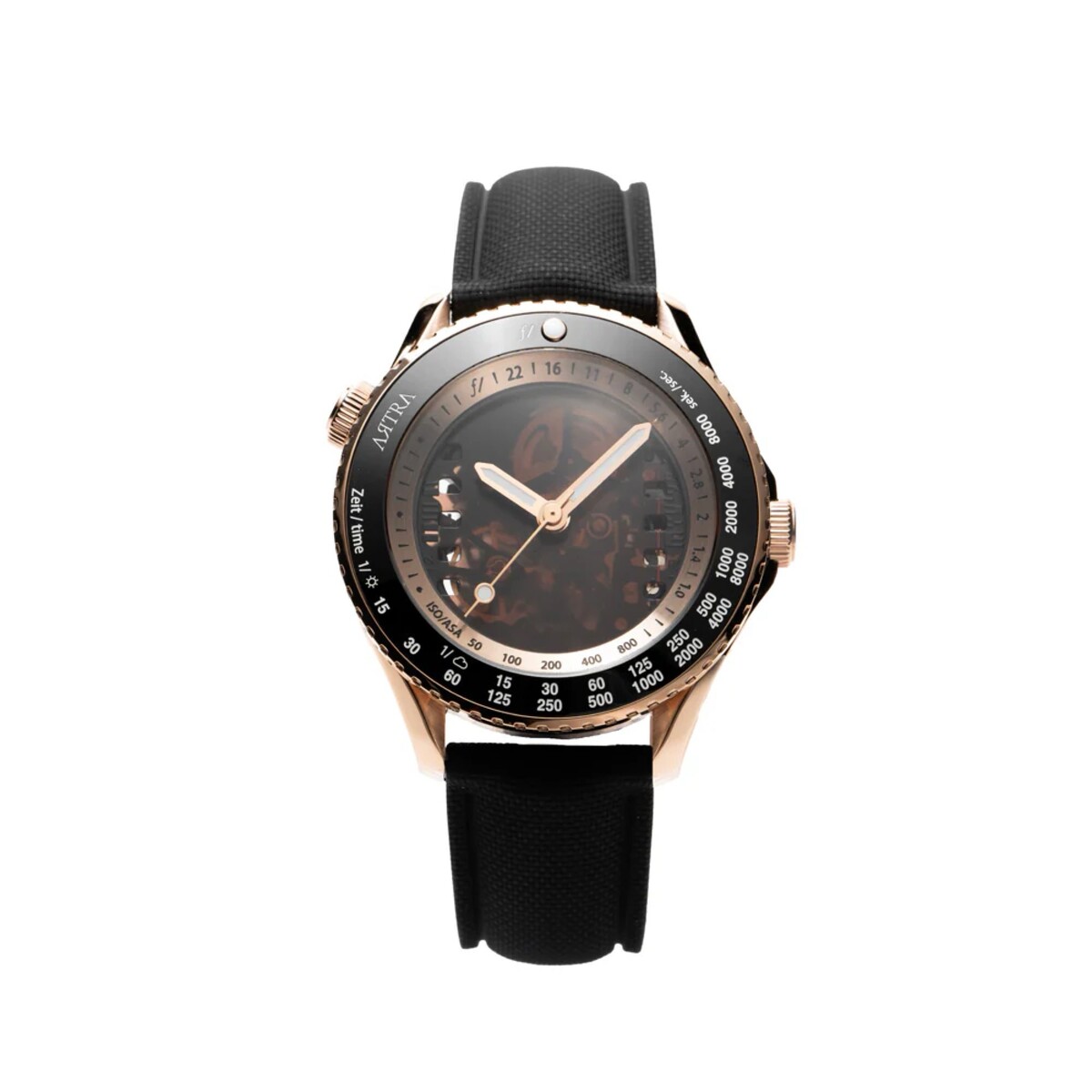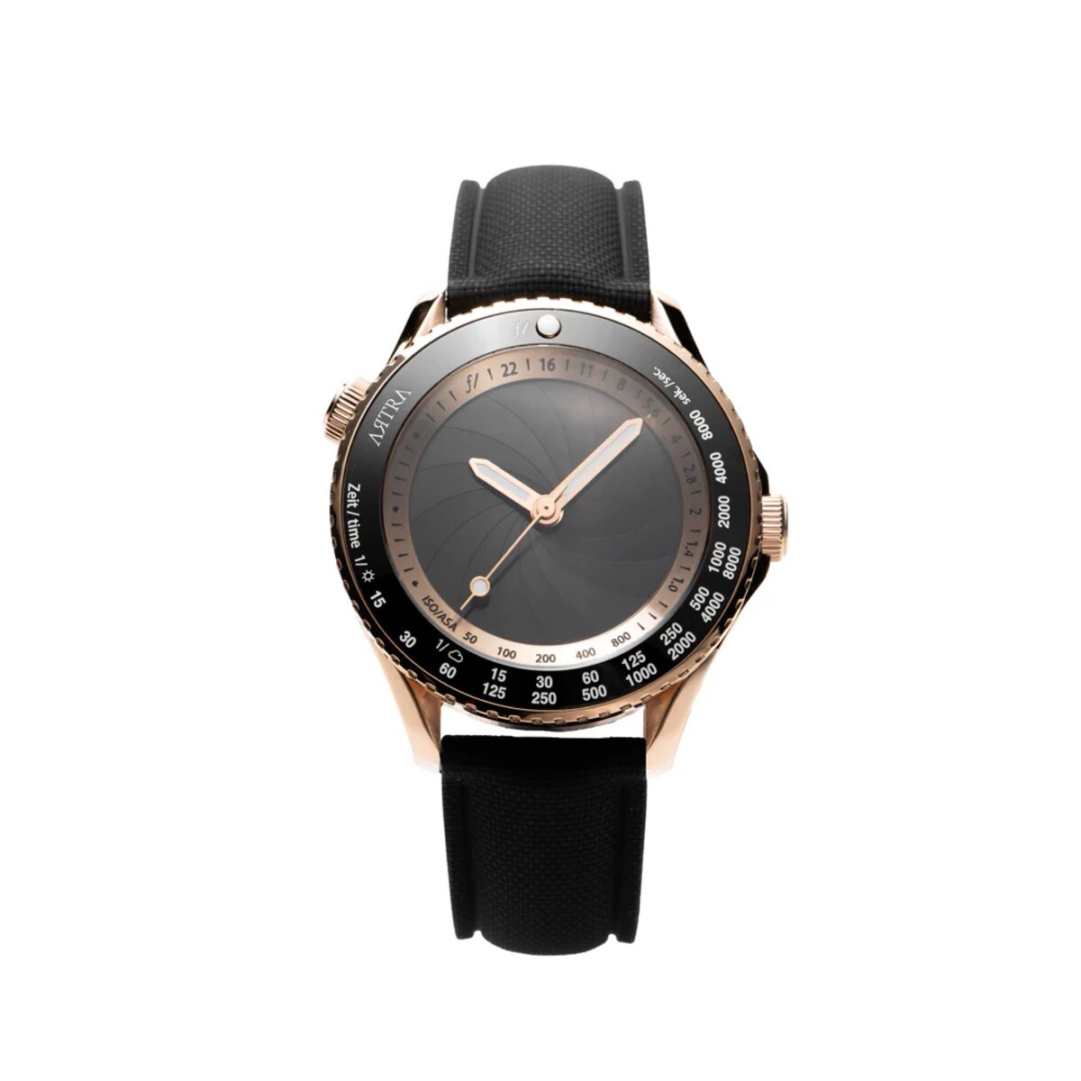 Cuando se abre la abertura, se revela una esfera parcialmente transparente, diseñada para parecerse a una película de 35 mm. La transparencia permite ver el movimiento en su interior, mientras que una ventana en la parte trasera del reloj ofrece una mejor visión del mecanismo. Las marcas de apertura de f/1,0 a f/16 aparecen en el lado izquierdo de la caja, mientras que el bisel está marcado con números que indican la velocidad de obturación y el ISO de la película.