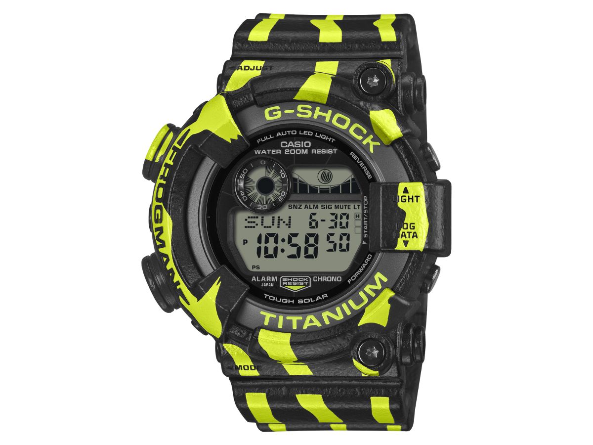 El Casio G-Shock GW-8200TPF-1 tiene un llamativo diseño en verde fluorescente y negro, con tres rayas que imitan las de la rana venenosa. El bisel exterior y la correa de resina del reloj tienen una textura similar a la piel de la rana, y el logotipo de la rana buceadora de la marca se ha grabado en el fondo metálico de la caja. El modelo tiene un bisel interior de titanio, el reloj mide 52,0 x 50,2 x 18,0 mm (~2,05 x 1,98 x 0,71 pulgadas) y pesa 84 g (~3,0 oz).