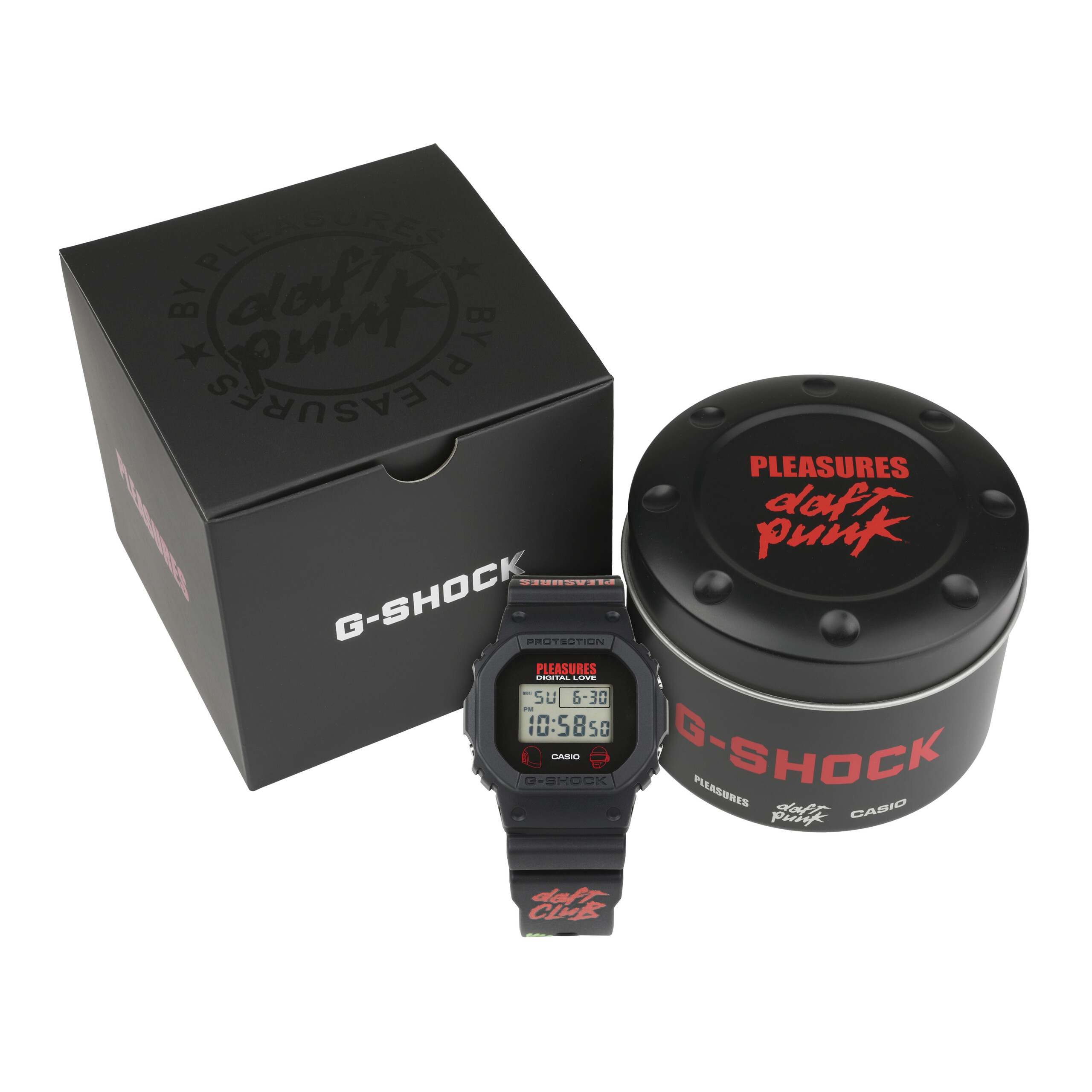 Este modelo de triple colaboración presenta la característica caja "cuadrada" del DW-5600, con la marca y elementos visuales inspirados en el icónico dúo de productores de música electrónica Daft Punk, incluyendo motivos de cascos y textos en la correa y la banda. La retroiluminación también muestra imágenes de Daft Punk. Las ventas se limitarán a la tienda en línea de Casio EE.UU. y a la tienda oficial de Pleasures. El mercado japonés no tendrá un lanzamiento oficial, según Great G-Shock Worldpero se esperan importaciones paralelas. Sin embargo, se prevé que los precios sean elevados debido a la limitada disponibilidad.