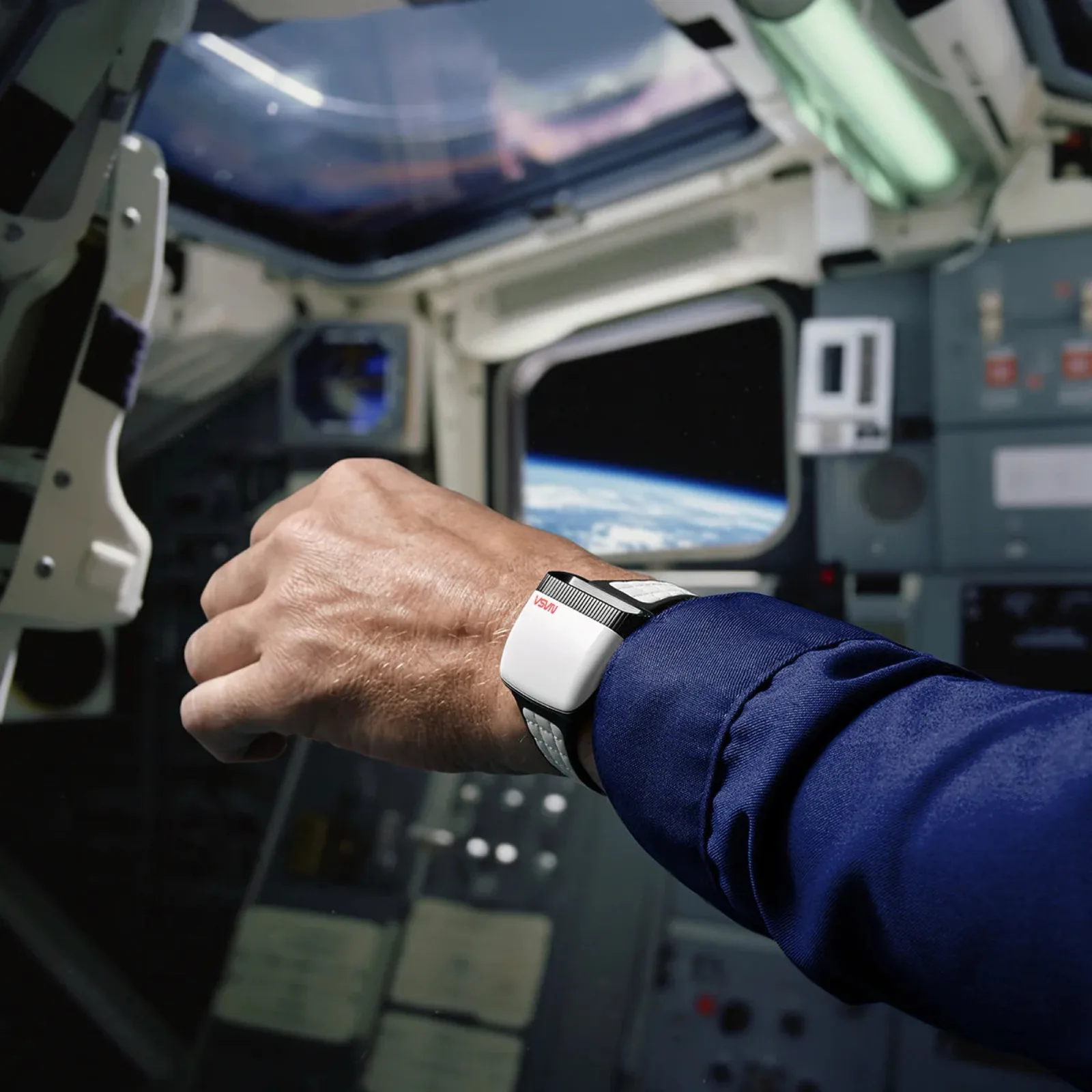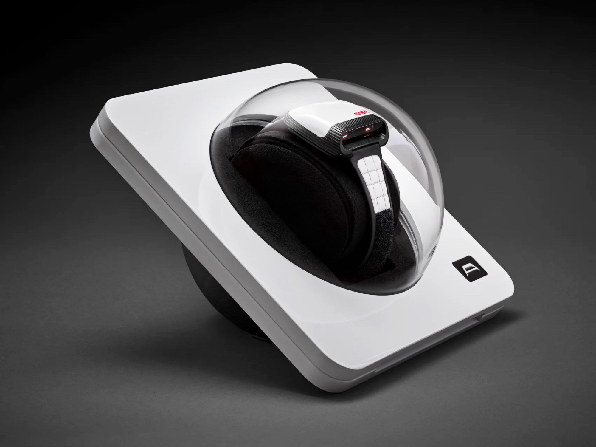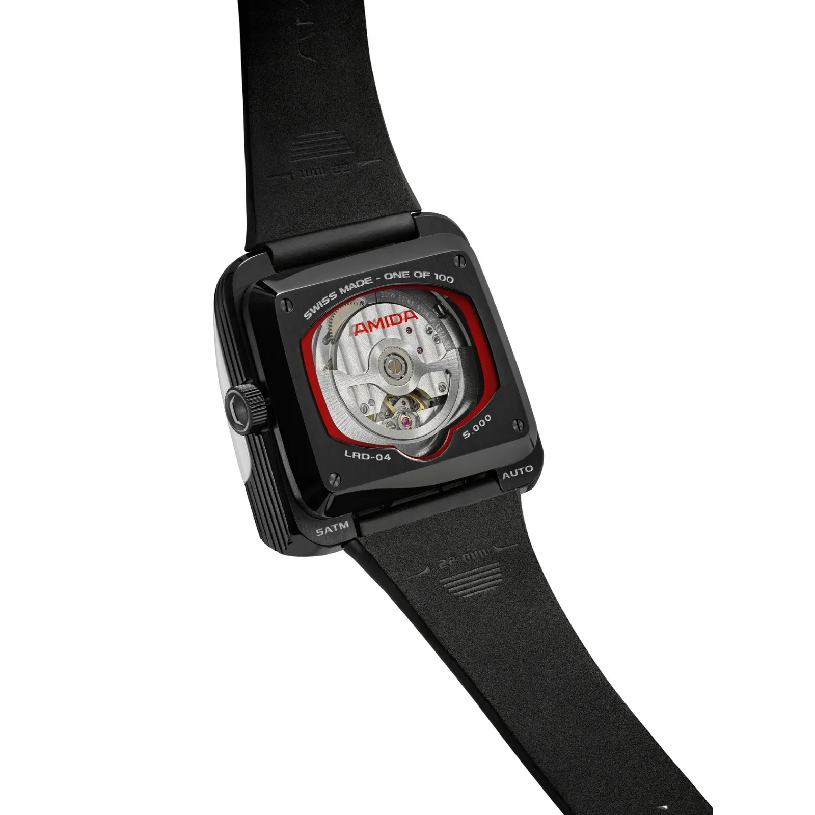 La correa combina el cuero blanco con un cierre de velcro, como el que utilizan los astronautas, que permite ajustar infinitamente la longitud de la correa. El fondo es de acero inoxidable y permite ver el movimiento Soprod Newton P092, equipado con 23 rubíes y al que sólo hay que dar cuerda cada 44 horas. La caja casi cuadrada tiene una longitud de canto de 39 milímetros y una altura de 15,6 milímetros con un peso de 90 gramos
