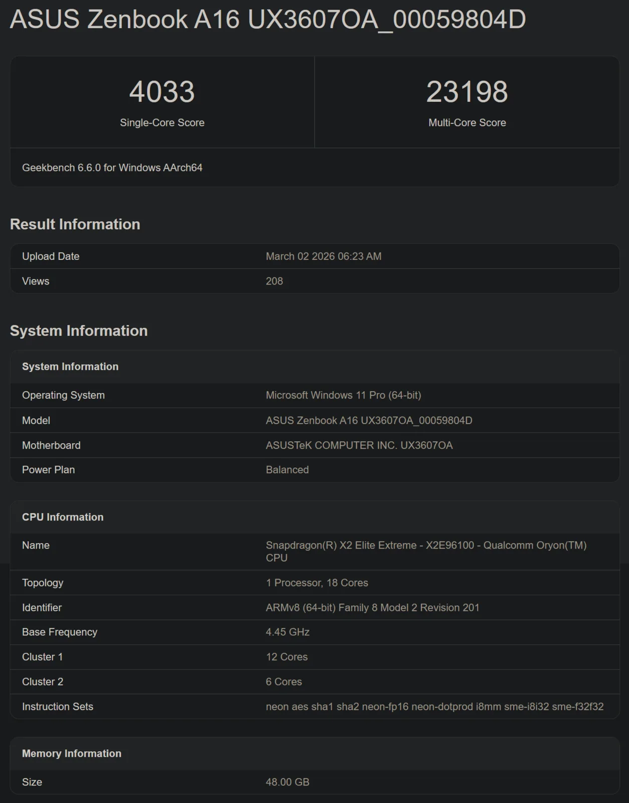 El rendimiento de la CPU y la GPU del Snapdragon X2 Elite Extreme X2E-96-100 impresionan en su debut en Geekbench junto al portátil Asus