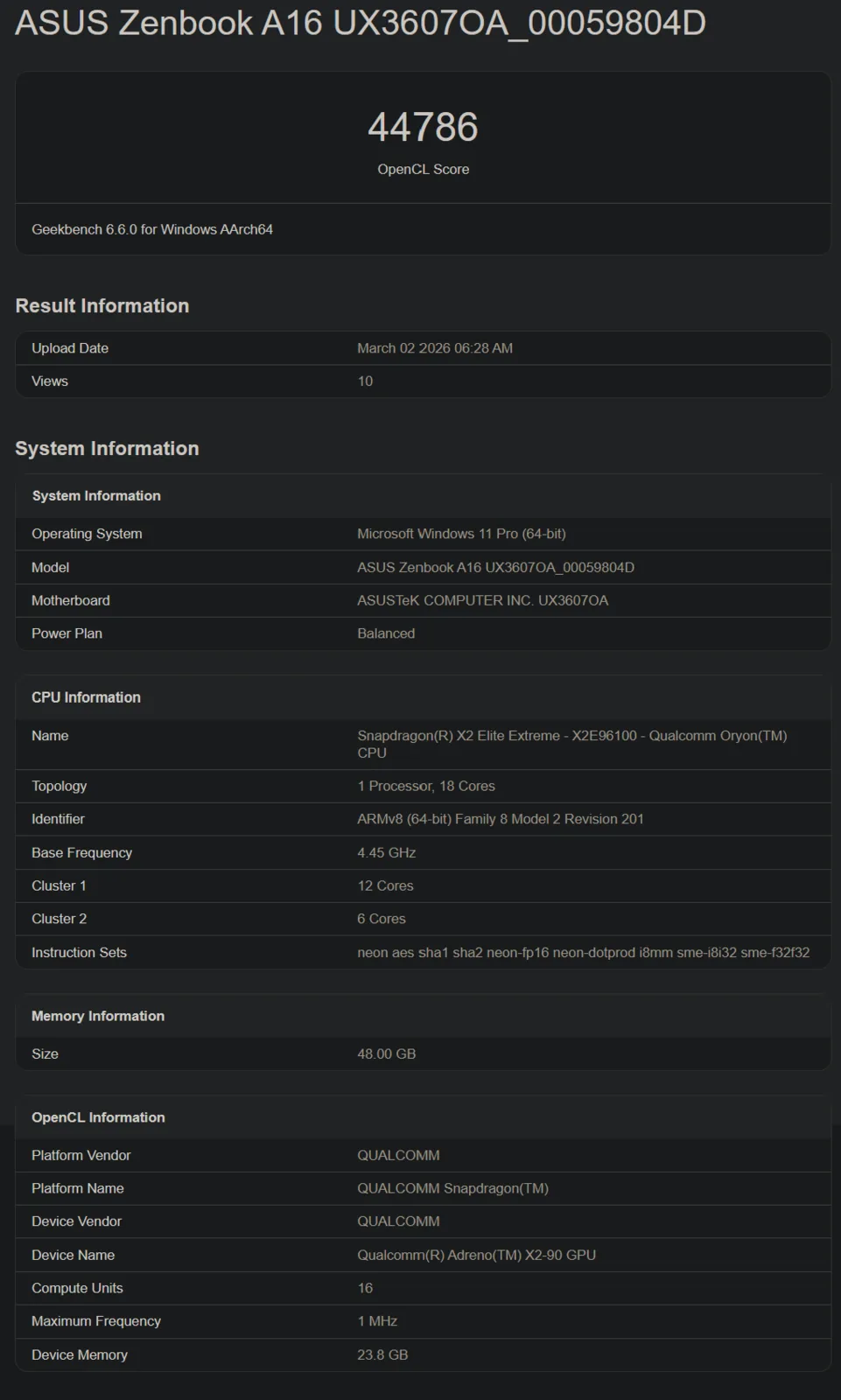 Un segundo listado nos permite echar un vistazo al rendimiento de la GPU del Snapdragon X2 Elite Extreme X2E-96-100. La GPU Adreno X2-90 obtiene 44.786 puntos en la prueba comparativa OpenCL de Geekbench. Geekbench dice que tiene 16 CUs, pero no se puede confiar en la puntuación porque su velocidad de reloj reportada es de sólo 1 MHz. No obstante, aún consigue ofrecer casi el doble de rendimiento que la última generación Adreno X1-85 Que apenas alcanza 23.854 puntos en la misma prueba.