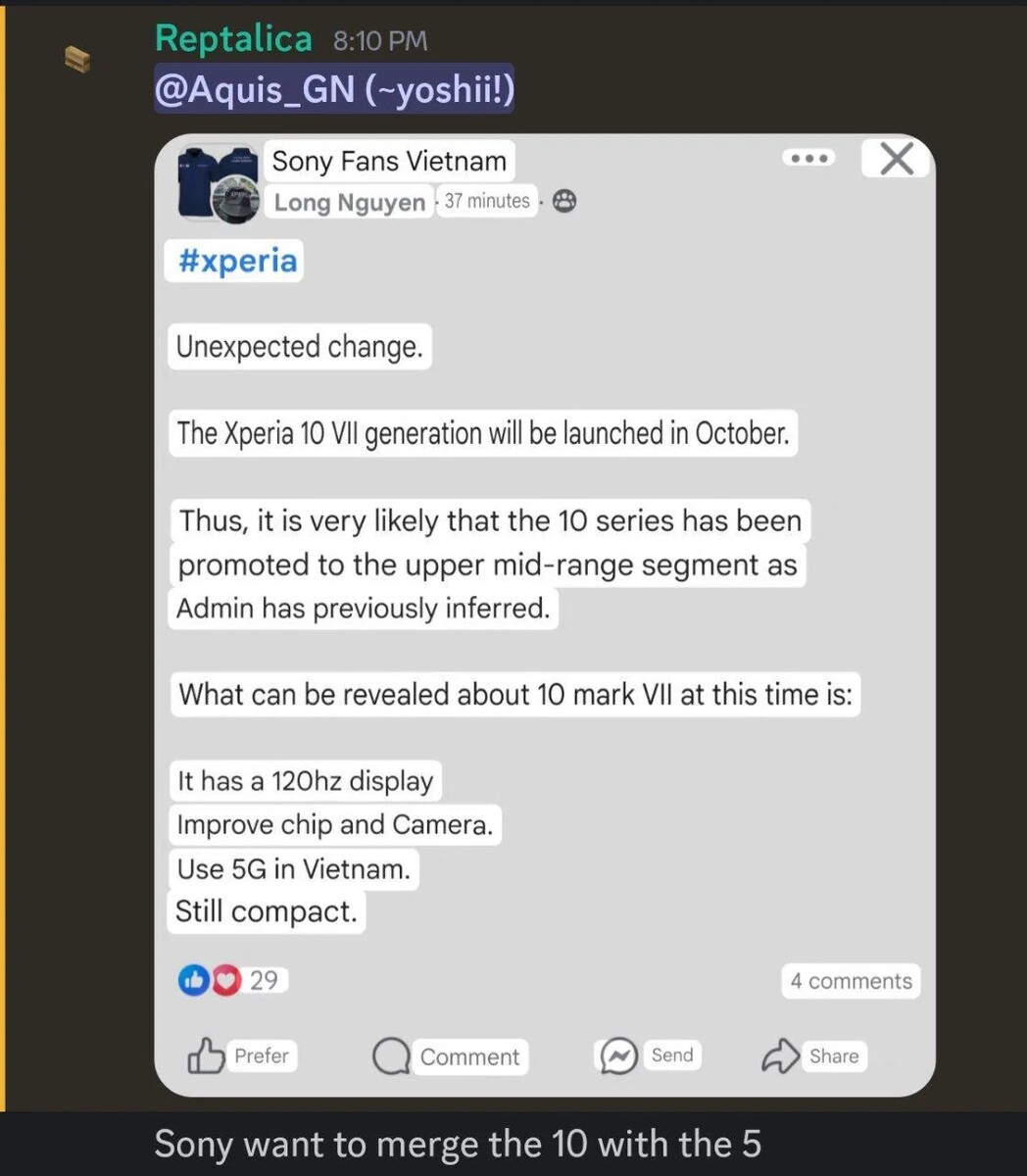 Los detalles proceden de un informador fiable en Esato llamado Spektykles y de un post realizado por u/Aquis_GN en Reddit coinciden en que la variante Mark 7 del Xperia 10 se lanzará en octubre. La primera fuente afirma que "se lanzará el 10 (de octubre)", mientras que la segunda, que supuestamente procede de un grupo de Facebook de Sony Fans Vietnam, afirma que el lanzamiento en octubre permite "promocionar el Sony Xperia 10 VII al segmento de gama media alta". Para hacerse una idea del estado actual del segmento de la gama Xperia 10, merece la pena comparar el precio en el Reino Unido del Xperia 10 VI en https://www.sony.co.uk/smartphones/gallery con el del Xperia 1 VI: 349 libras frente a 1.299 libras (~468 dólares frente a 1.742 dólares).