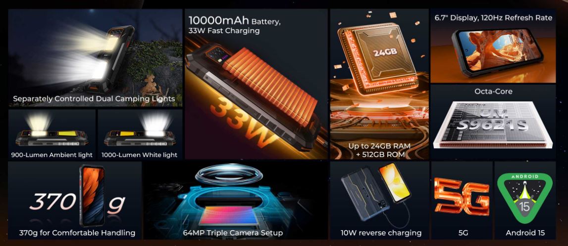 En cualquier caso, el smartphone de Oukitel está equipado con una batería de 10.000 mAh que puede cargarse con hasta 33 vatios. También admite carga inversa de 10 W, por lo que puede utilizarse como un banco de energía. Además, el WP58 Pro está alimentado por un SoC con ocho núcleos y soporte 5G, por lo que no está limitado a 4G LTE como otros smartphones robustos baratos. El resto de especificaciones incluyen 8 GB de RAM, mientras que el almacenamiento masivo de 512 GB también tiene un tamaño razonable. El teléfono funciona con Android 15 nada más sacarlo de la caja, y los usuarios pueden ampliar el almacenamiento mediante microSD sacrificando una de las ranuras dobles para tarjetas SIM.