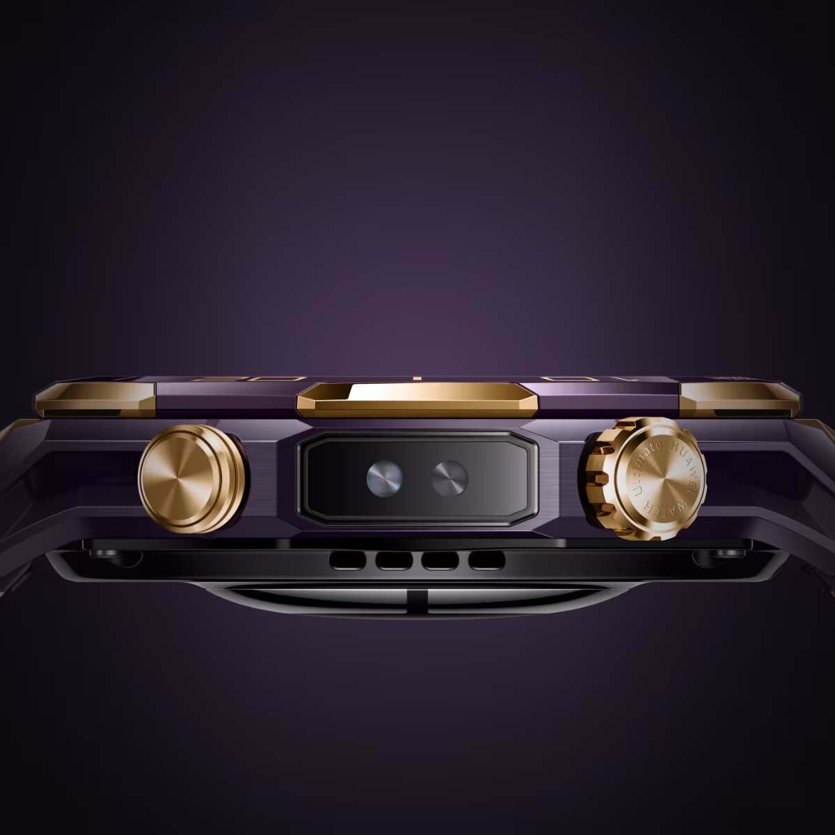 El Huawei Watch Ultimate Design Royal Gold tiene un diseño púrpura y dorado, con un bisel de cerámica con detalles en oro de 18K y 24K. La carcasa está fabricada con un metal líquido a base de circonio, del que se dice que es especialmente resistente, y la caja hueca contribuye a hacerlo más ligero. El reloj viene con una duradera correa de aleación de titanio púrpura y dorada, la esfera está protegida por un cristal de zafiro y su corona también está chapada en oro de 18 quilates.